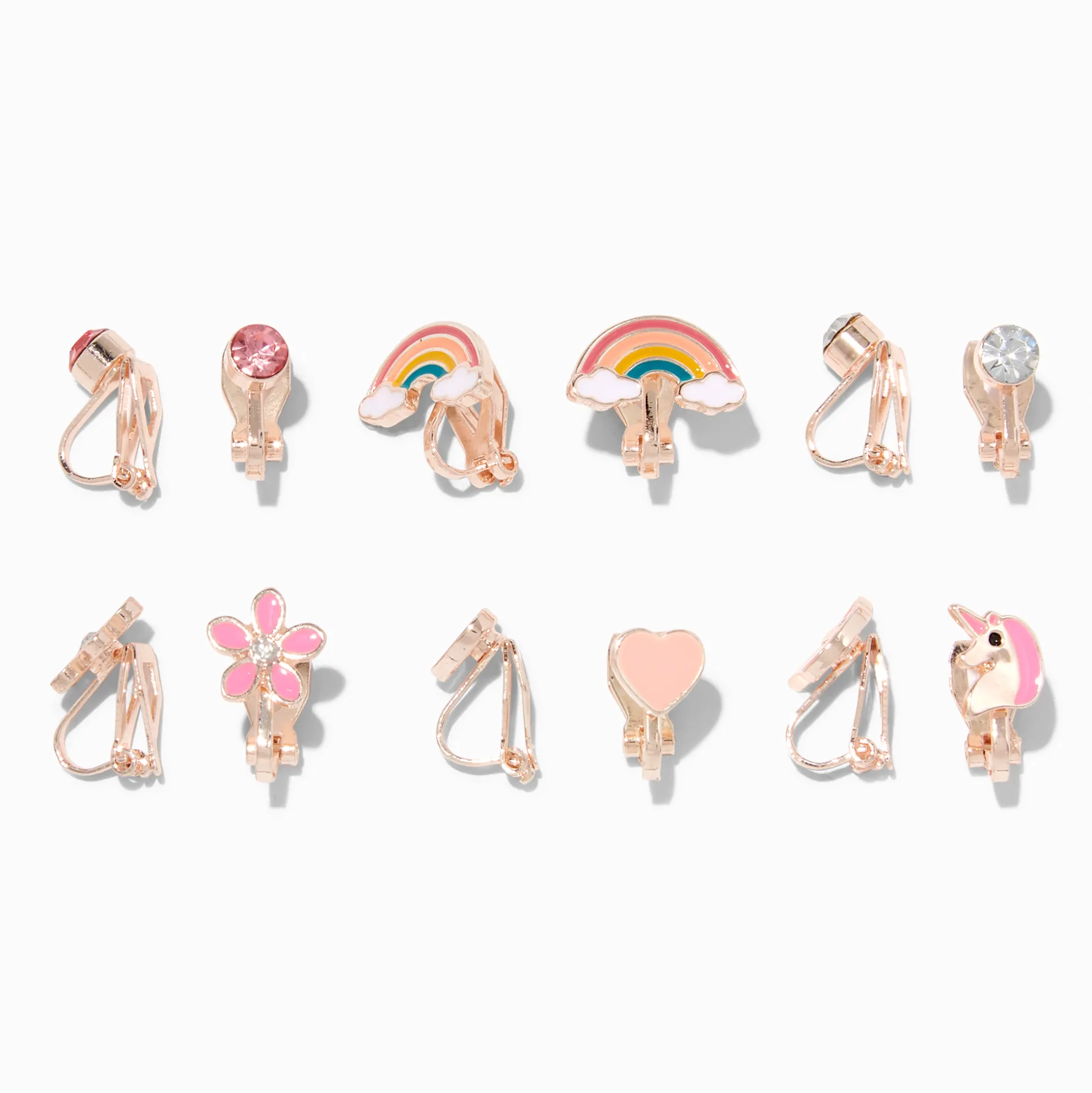Expand your clip-on collection with this 6-pair set. It includes bezeled faux crystals, rainbows, hearts, unicorns, and daisies.