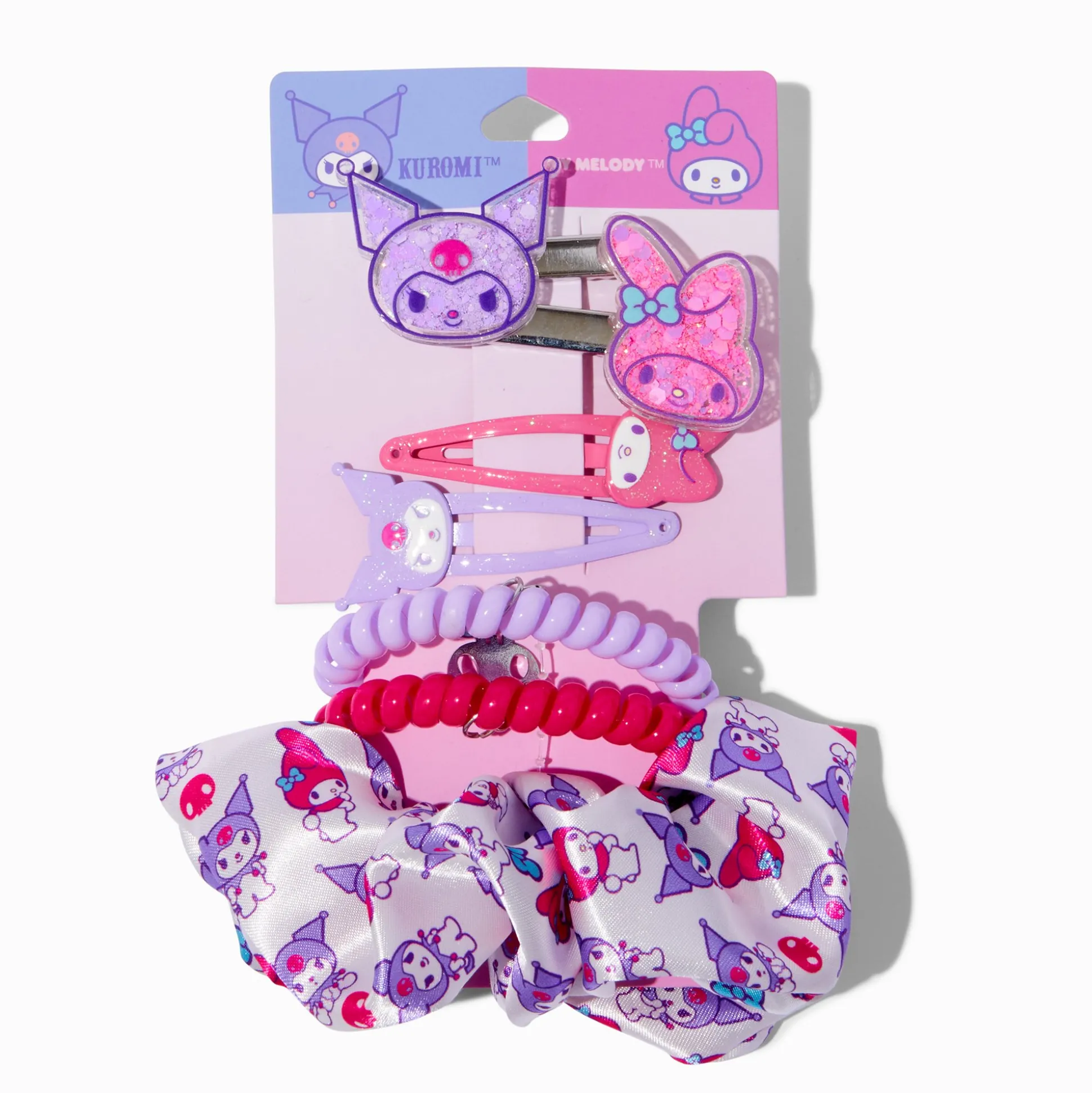 Always the perfect tool to keep your hair looking on fleek with this My Melody™ & Kuromi™ hair set. It includes four snap clips, two hair ties, and one scrunchie with your fave characters and motifs.