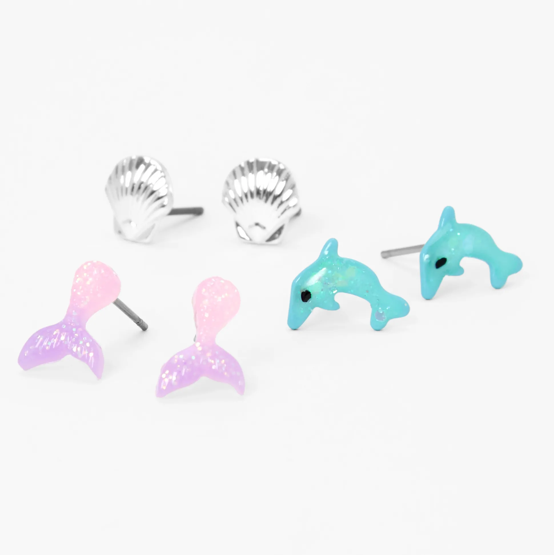 Show off your love for the sea with these stud earrings. The three-pack includes silver-tone seashells, glitter dolphins, and glitter mermaid tails. Wear these for your next beach day.