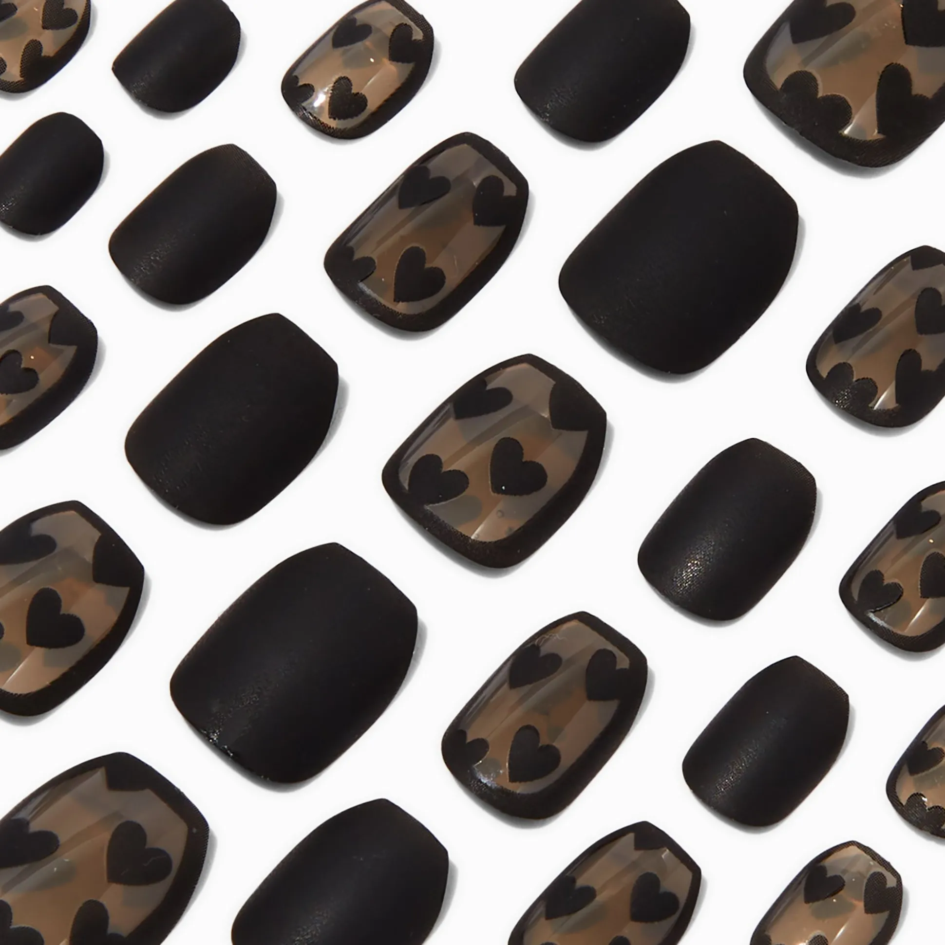 Moody vibes will be right at your fingertips with this on-trend set of faux nails. Coffin-shaped nail set have a black sheer heart design. Vegan nails are easy to apply, just press on and go!