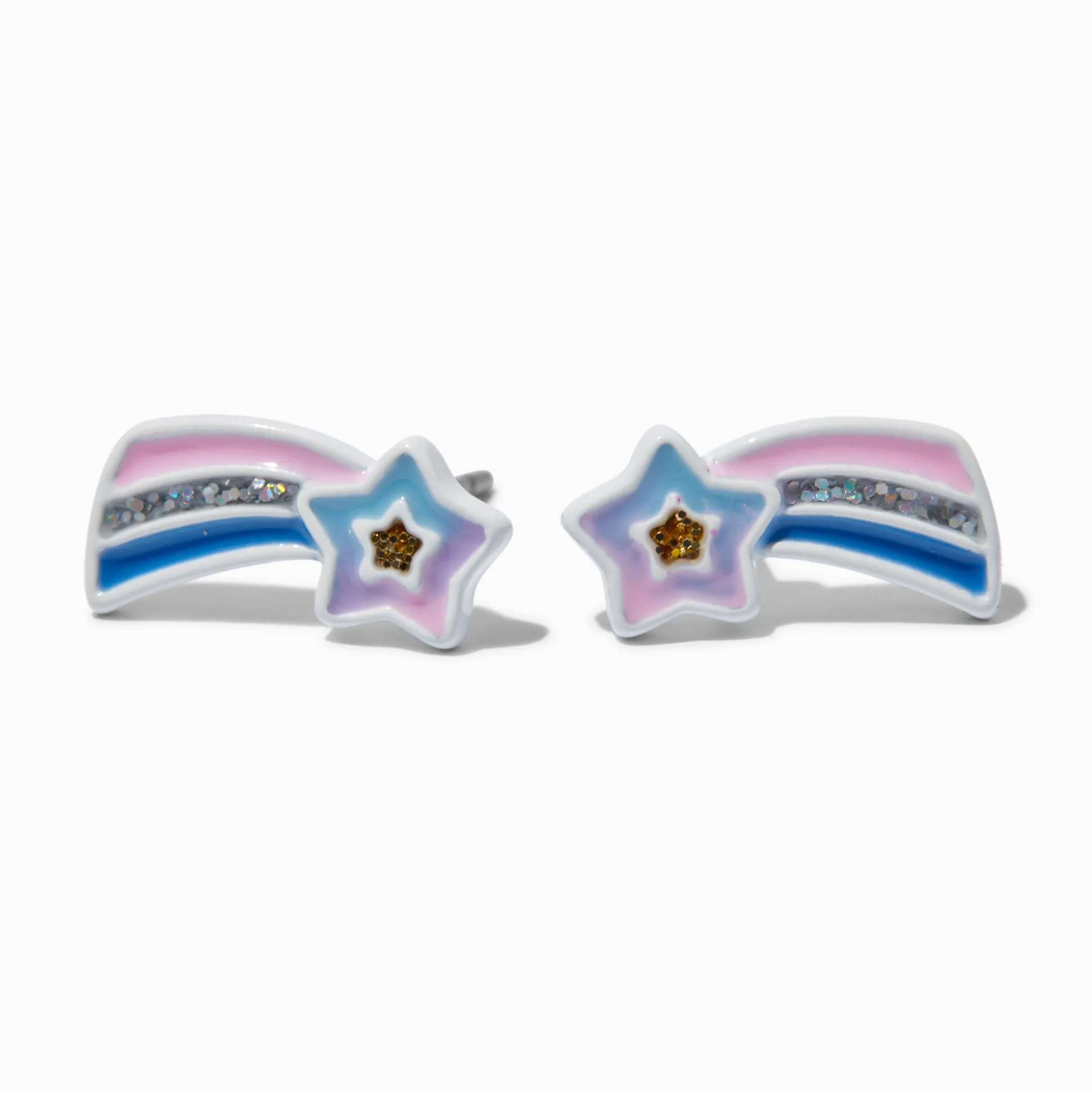 Shoot for the stars and rock these easy stud earrings. The post-back designs have shooting stars that are accented by glitter.