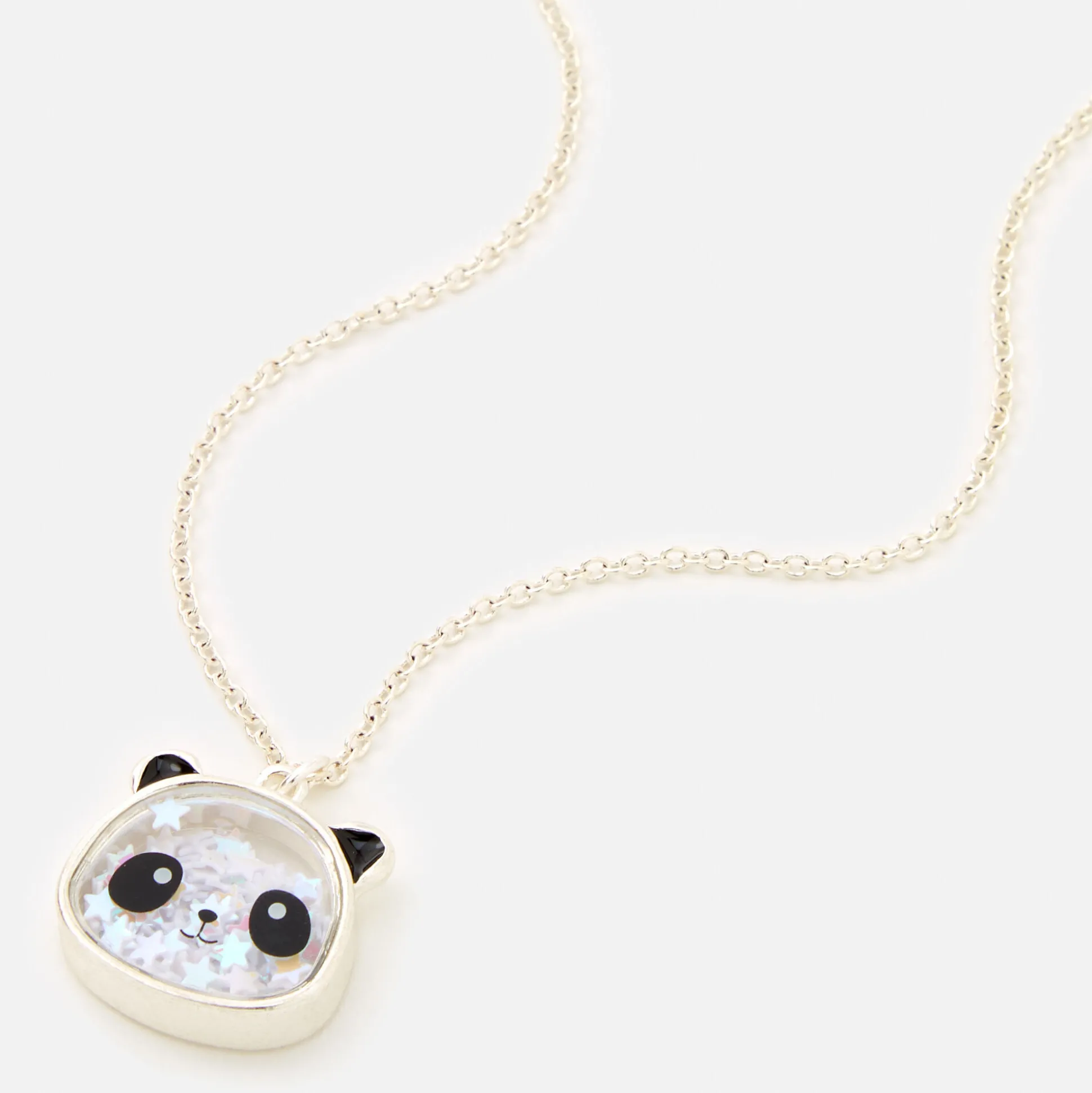 Get shakin’ with this panda shaker necklace! In a dazzling, silver iridescent, star glitter, this pendant is chic & funky. This shaker necklace is perfect for wearing on its own for a simple, fresh look or layered with some of your favorite statement pieces.
