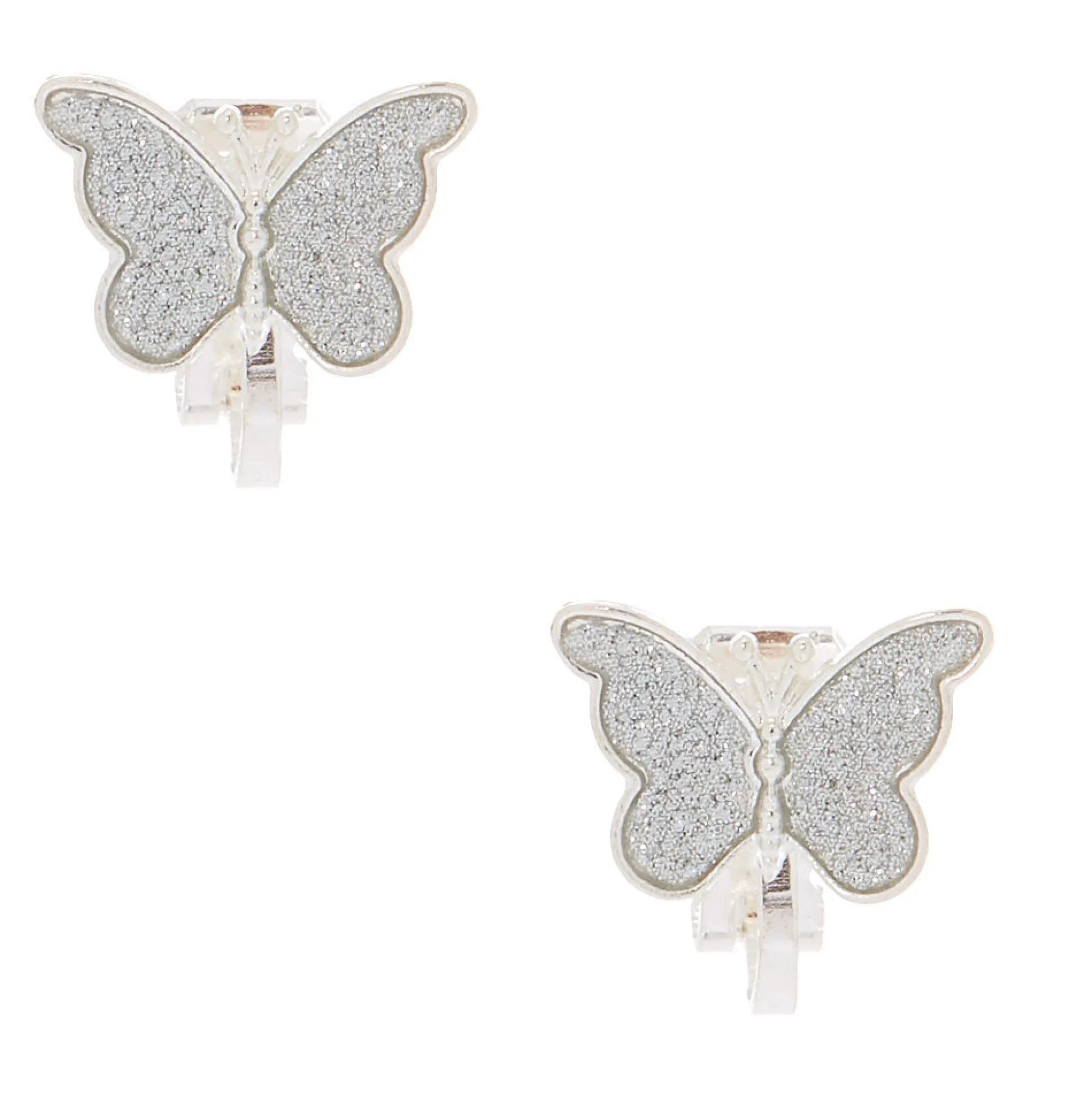 Feel as pretty as a butterfly while wearing these sparkly earrings! The clip-on earrings have a butterfly design that is covered with silver glitter.