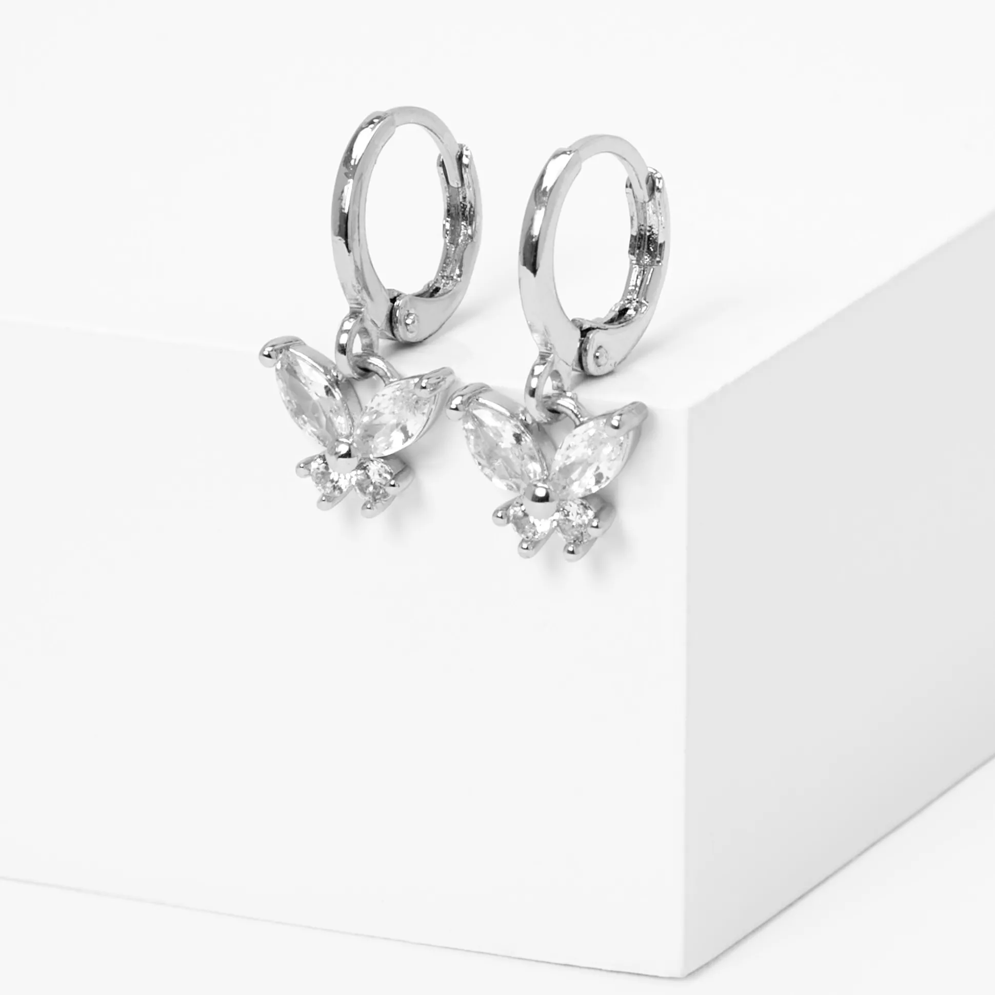 Add these cute earrings to your jewellery collection! Silver-tone huggie hoops feature a cubic zirconia butterly charm dangling from each earring.
