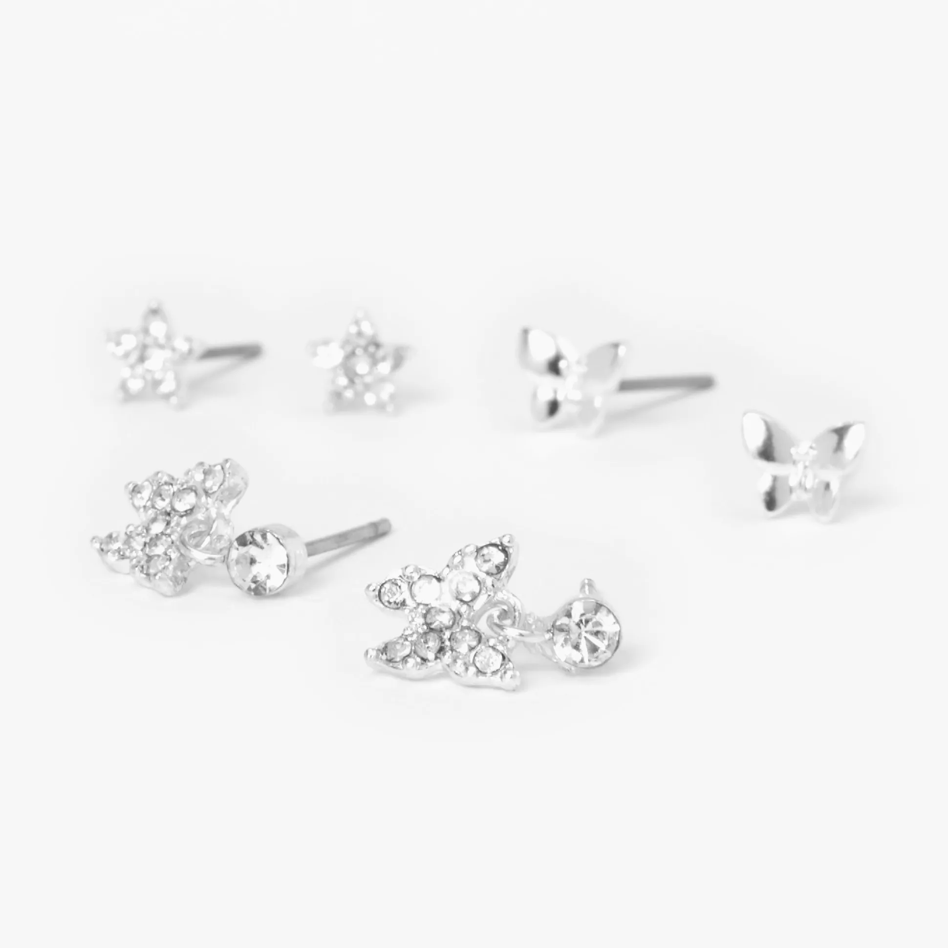 Flutter style is within your grasp with this earring set. The silver-tone set includes star studs and two pairs of butterfly earrings, so you’ll have a bunch of choices to mix and match. The star studs and the butterfly drop earrings are covered in sparkly faux crystals.
