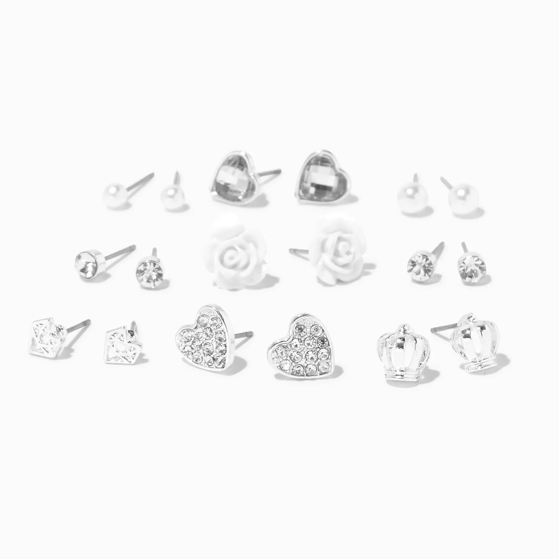 We declare thee queen of the studs! This expansive set includes many options to match your fit. This set includes nine pairs of studs, including crowns, roses, hearts, studs, and more.