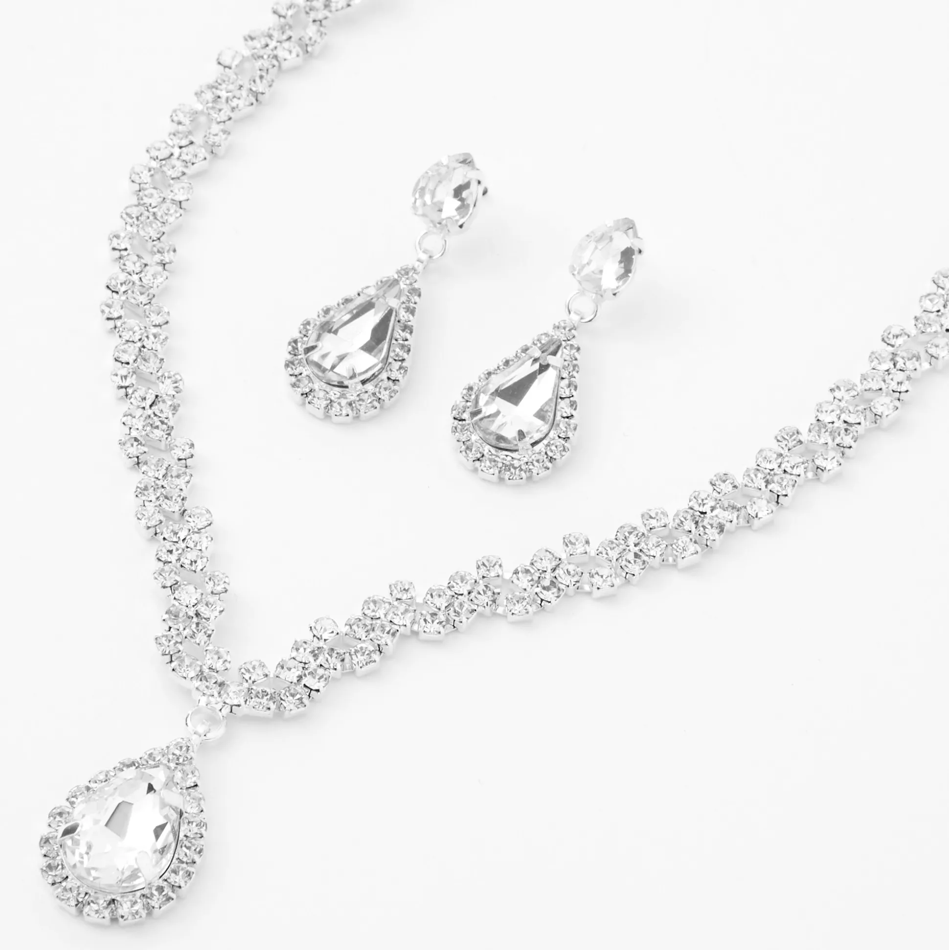 This jewellery set comes with a beautiful shimmery V-neck necklace and matching 1″ drop earrings that both have a silver-tone finish and clear glass rhinesones. Wear this set to your next special occasion for a glammed up look.