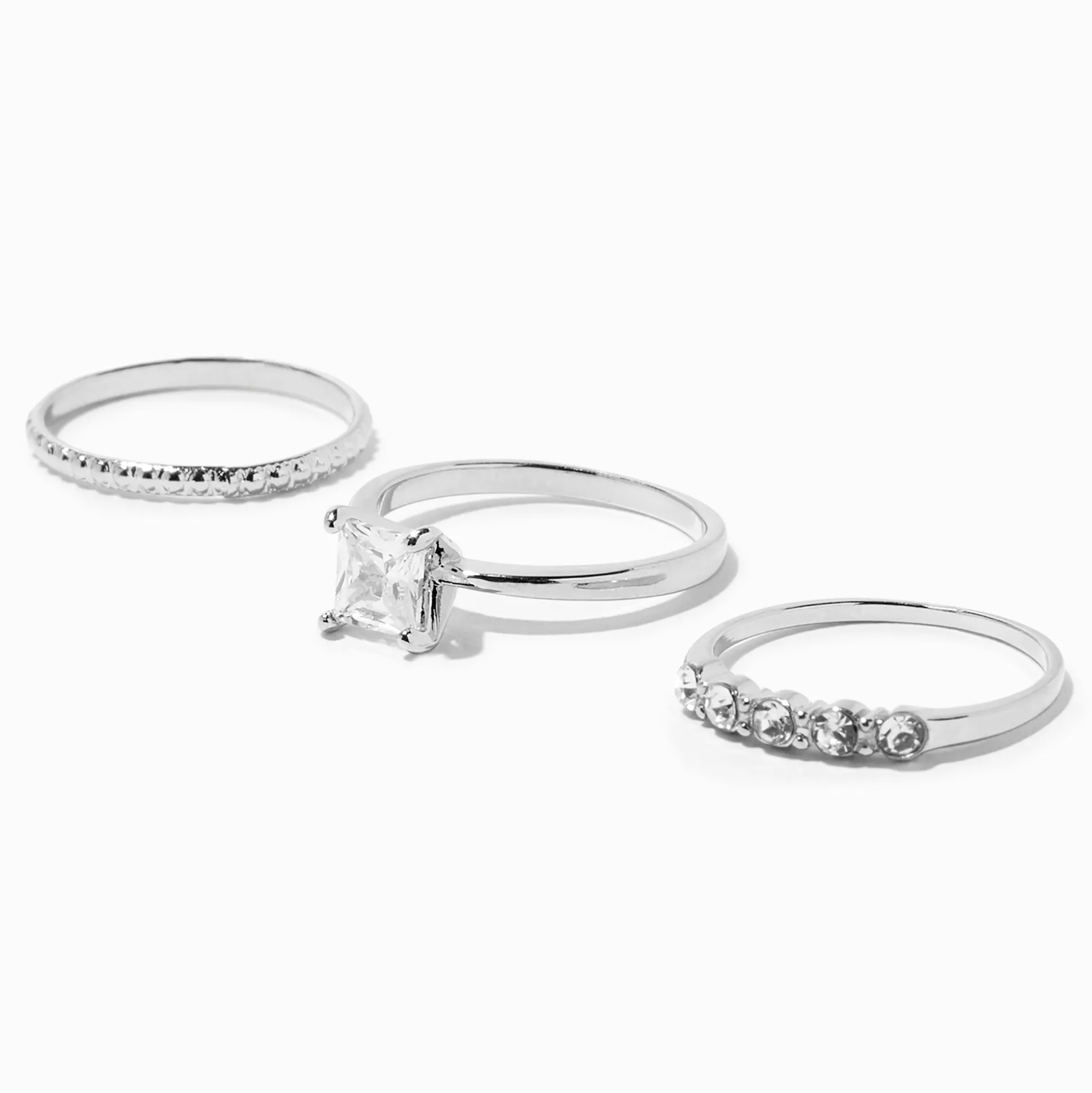 Create a classic ringscape with this three-pack. It includes one silver-tone ring with a row of faux crystals, one with a square faux cubic zirconia, and onoe with a textured band.