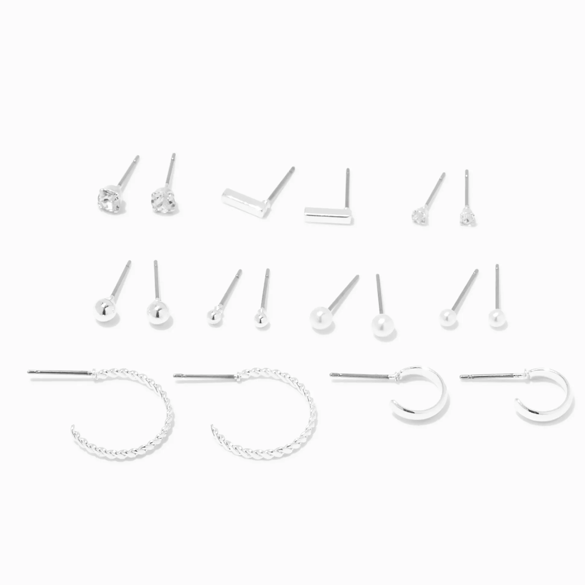 Expand your classic earring collection with this silver-tone set. The nine pairs include faux crystals, faux pearls, line designs, and smooth and textured hoops.