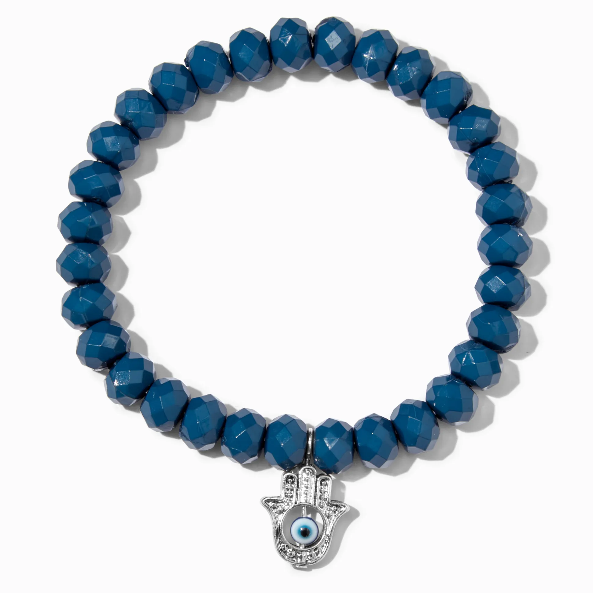 Beaded stretch bracelets are fun for mixing and matching! This one features blue beads and a dainty silver-tone hamsa hand charm.
