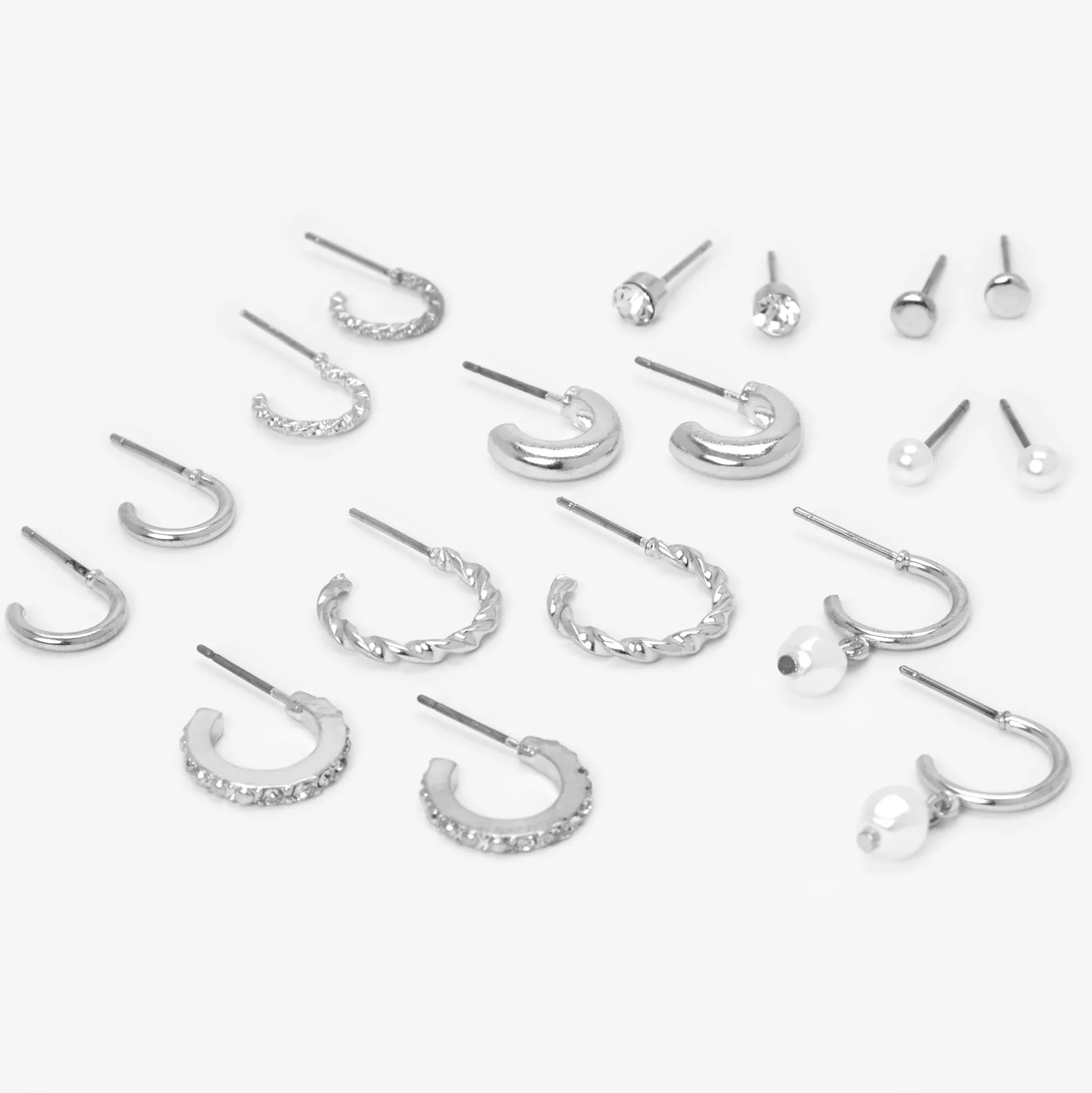Choose from the perfect set of everyday earrings! This silver-tone set includes 3 pairs of stud earrings and 6 pairs of huggie hoop earrings with faux crystal accents to add an extra touch of sparkle.