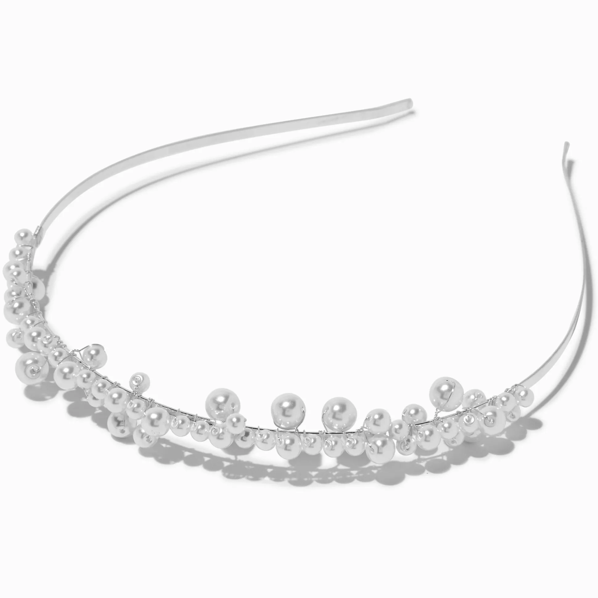 Dot your hair with the classic look of pearls with this headband. The silver-tone finish, thin band style is finished with faux pearls.
