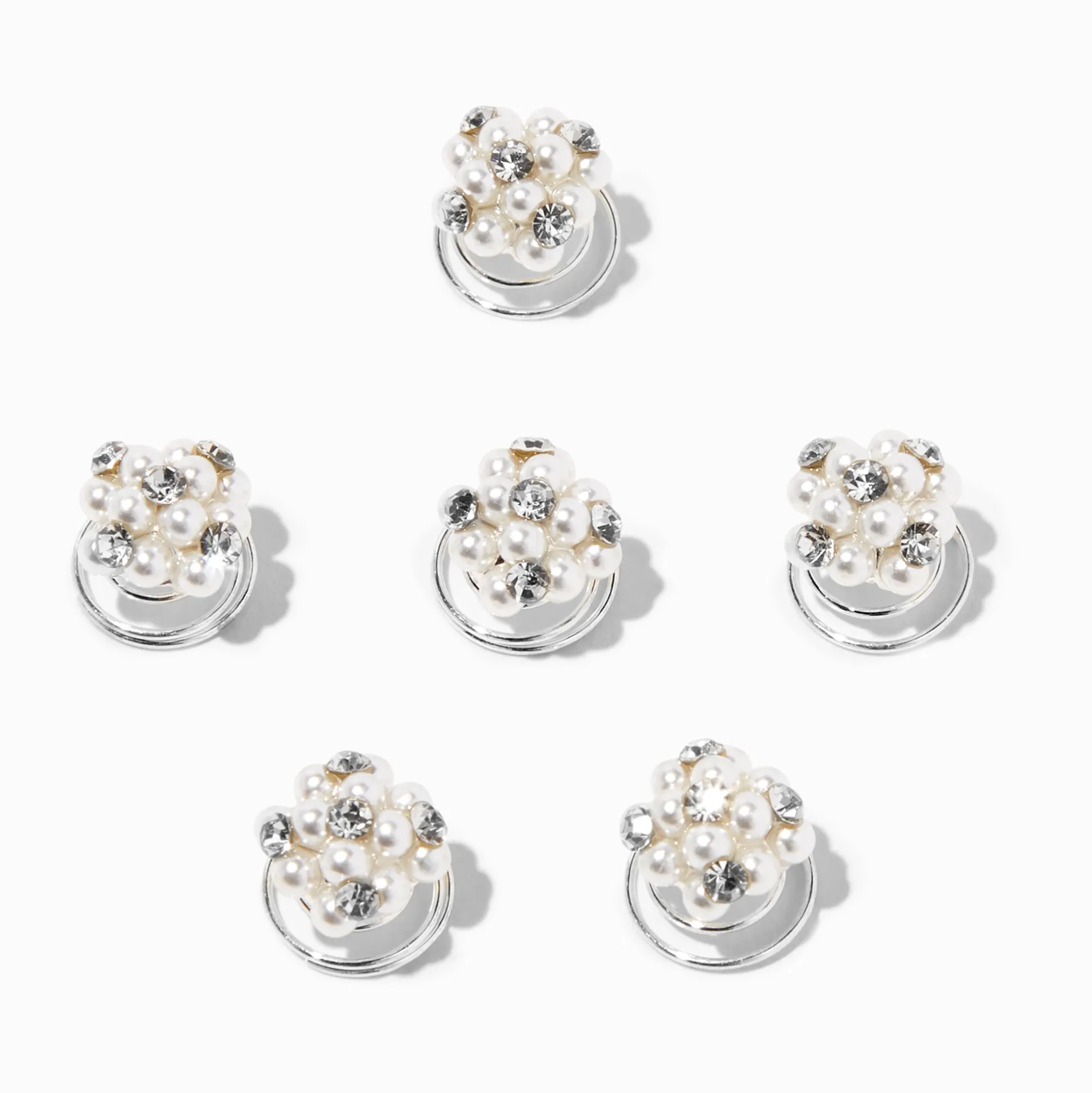 Decorate your hair for your next special event with these lovely hair spinners. The six-piece set has a silver-tone finish with a faux pearl and faux rhinestone cluster design.