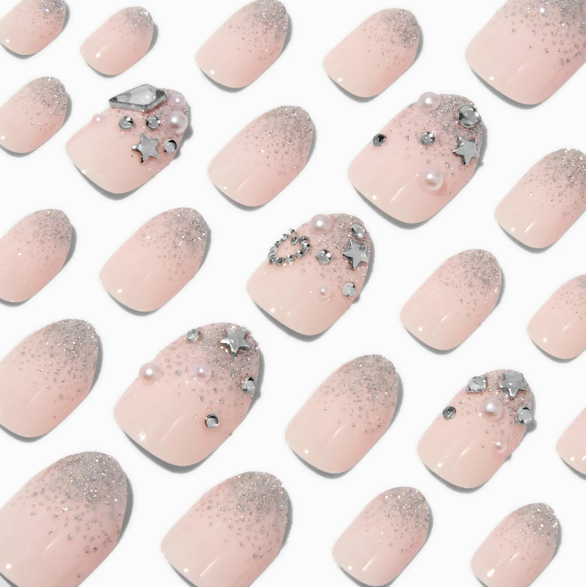 Serious glamour will be right at your fingertips with this on-trend set of faux nails. Stiletto-shaped nail set features star & bling details. Vegan nails are easy to apply, just press on and go!