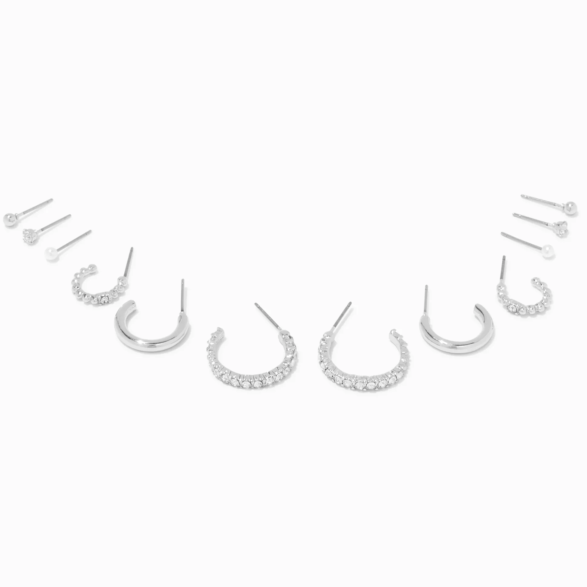 Show off your multiple ear piercings with this silver-tone set. It includes six pairs of earrings with three pairs of hoops and three pairs of studs with faux crystal details. Wear these all together or however you’d like. You’re the boss of you.