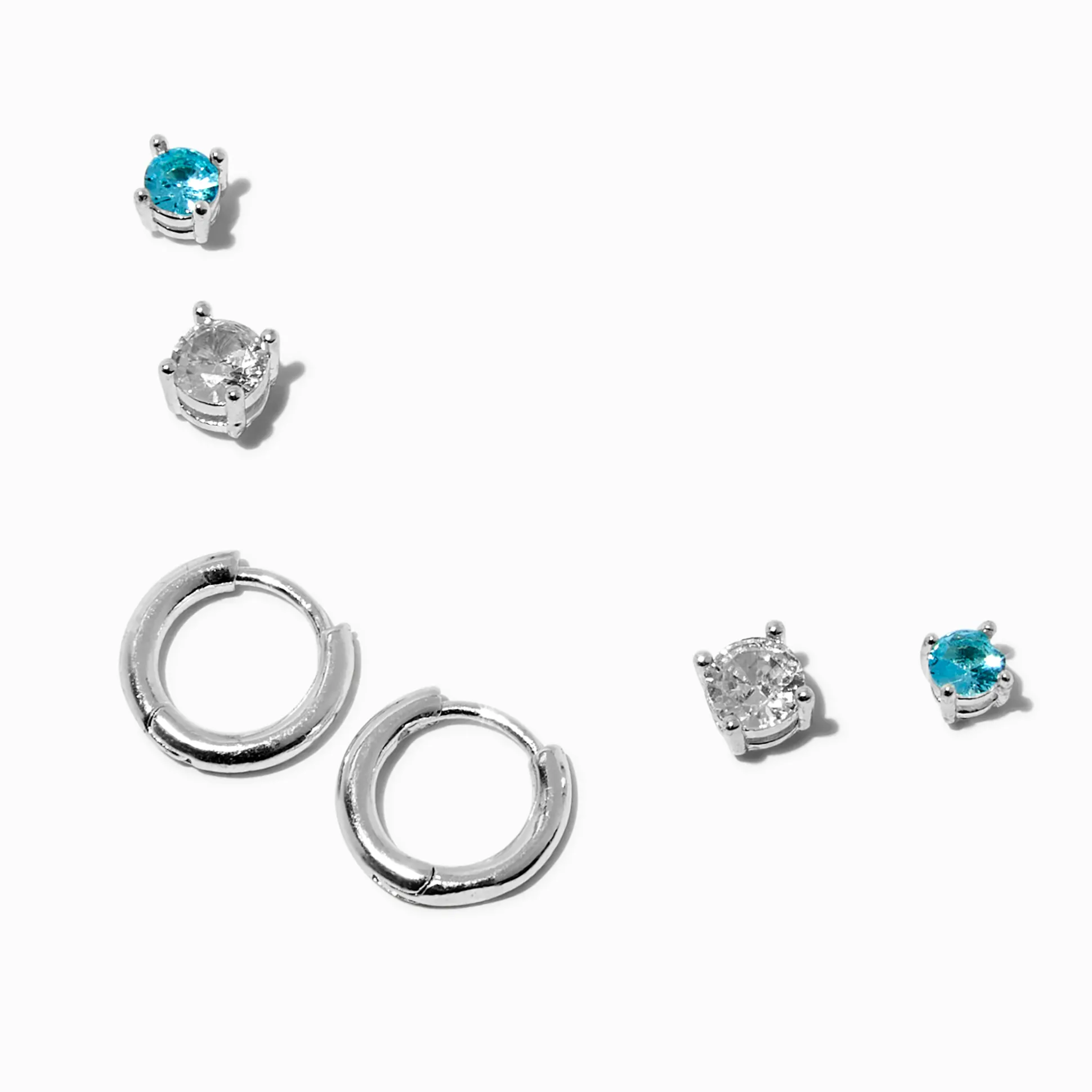 Show off your multiple ear piercings with this silver-tone set. It includes 5mm silver-tone huggie hoops, clear cubic zirconia studs, and aqua cubic zirconia studs. Wear these all together or however you’d like. You’re handing out the ear party invites.