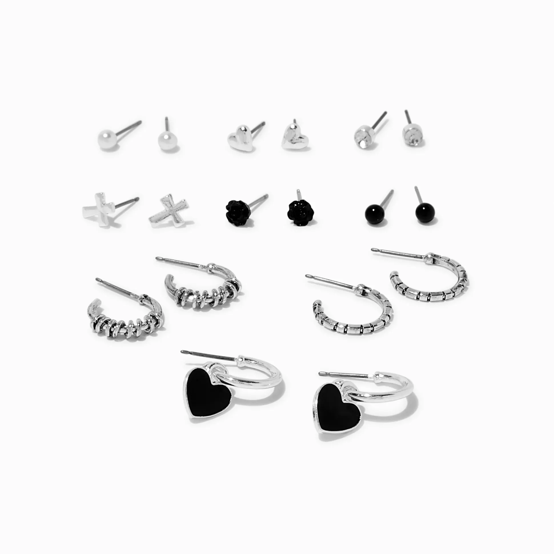 Variety is the spice of life and the goal of this earring set, which includes nine different pairs of earrings. Styles include carved roses, hearts, pearls, crosses, hoops, and more.