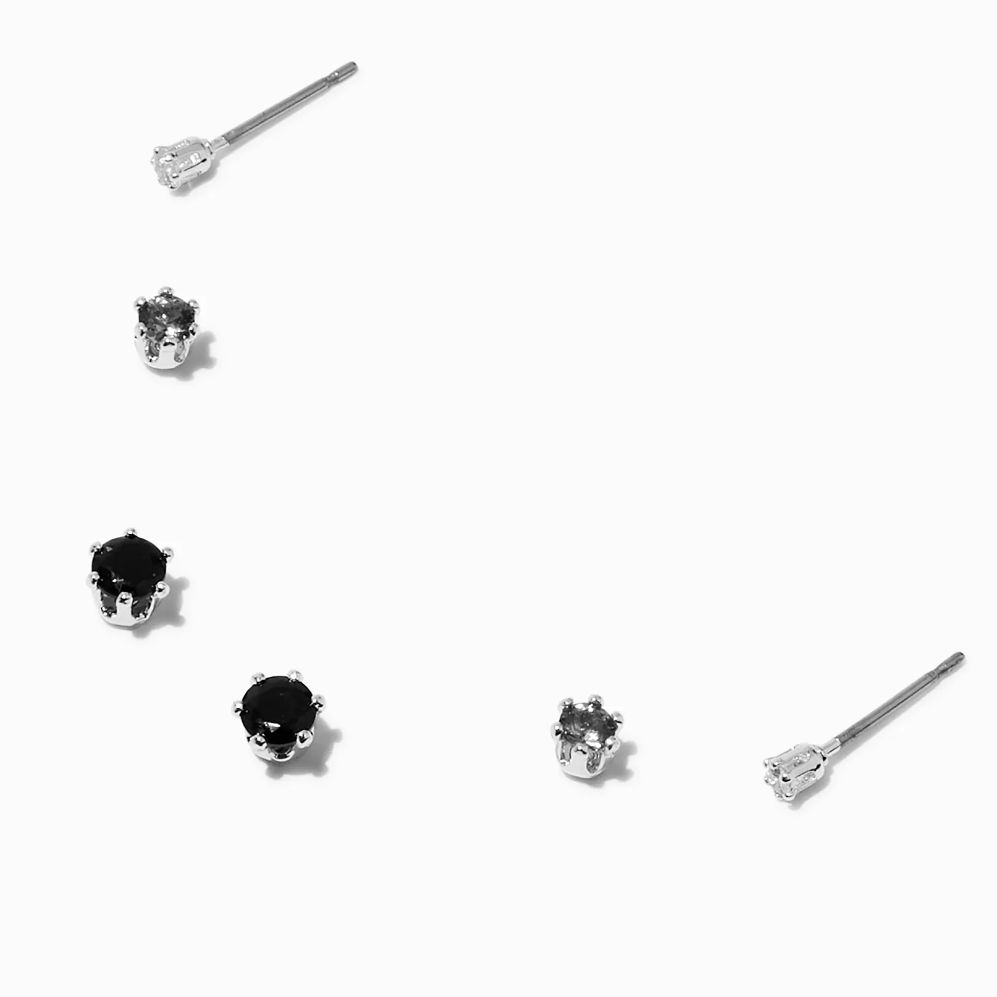 Sparkly cubic zirconia will never go out of style and this awesome earring set delivers them in three different colors that you will love. The set of silver-tone studs includes black, gray, and clear cubic zirconia in graduated sizes to pair perfectly with all your favorite looks. Wear them separately or stack them up to accent your multiple piercings.