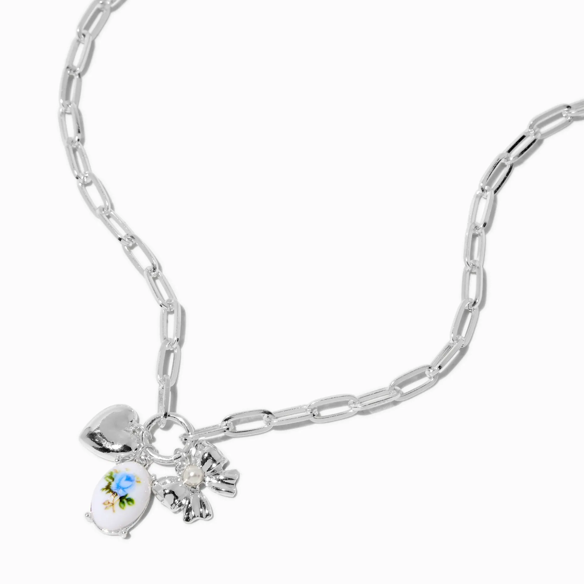 Show off your personal style in this silver-tone paperclip chain necklace. It has a heart charm, a round pendant with a blue flower design, and a bow with a faux pearl finisher.