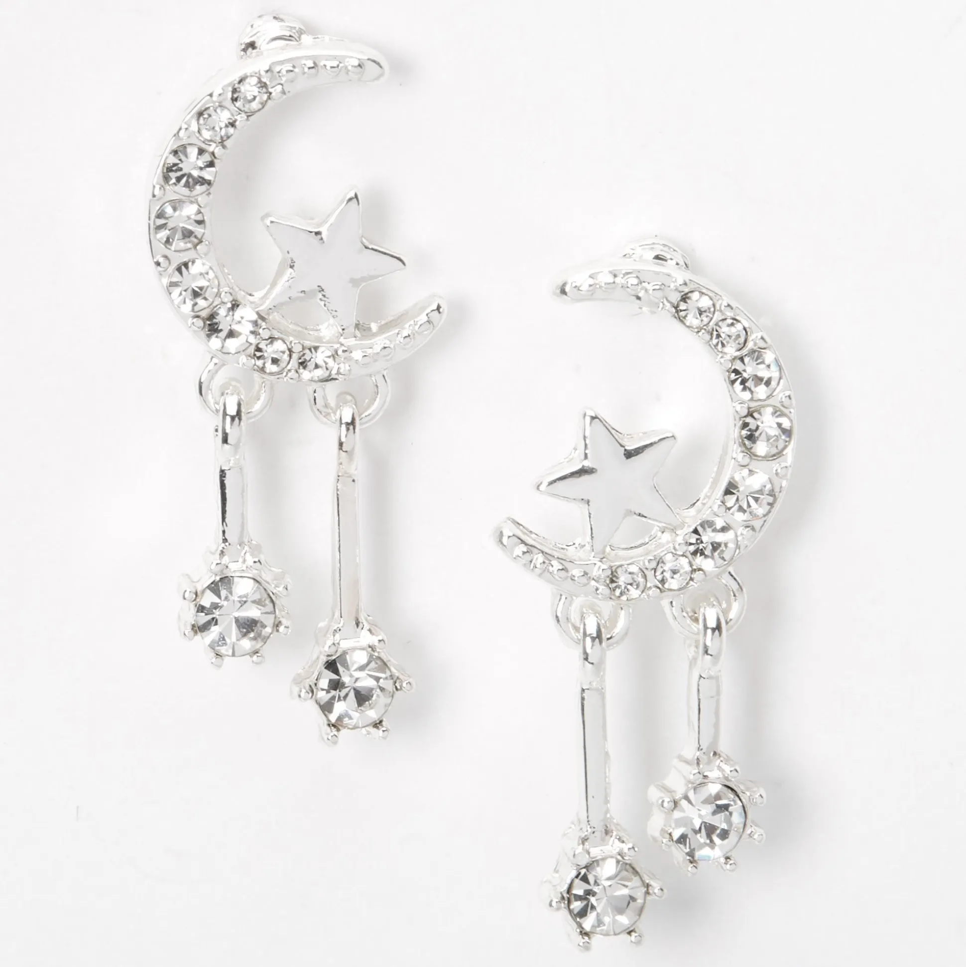 Get celestial vibes while wearing this pair of earrings. The silver-tone earrings feature a crescent moon with faux crystal stars hanging below them.