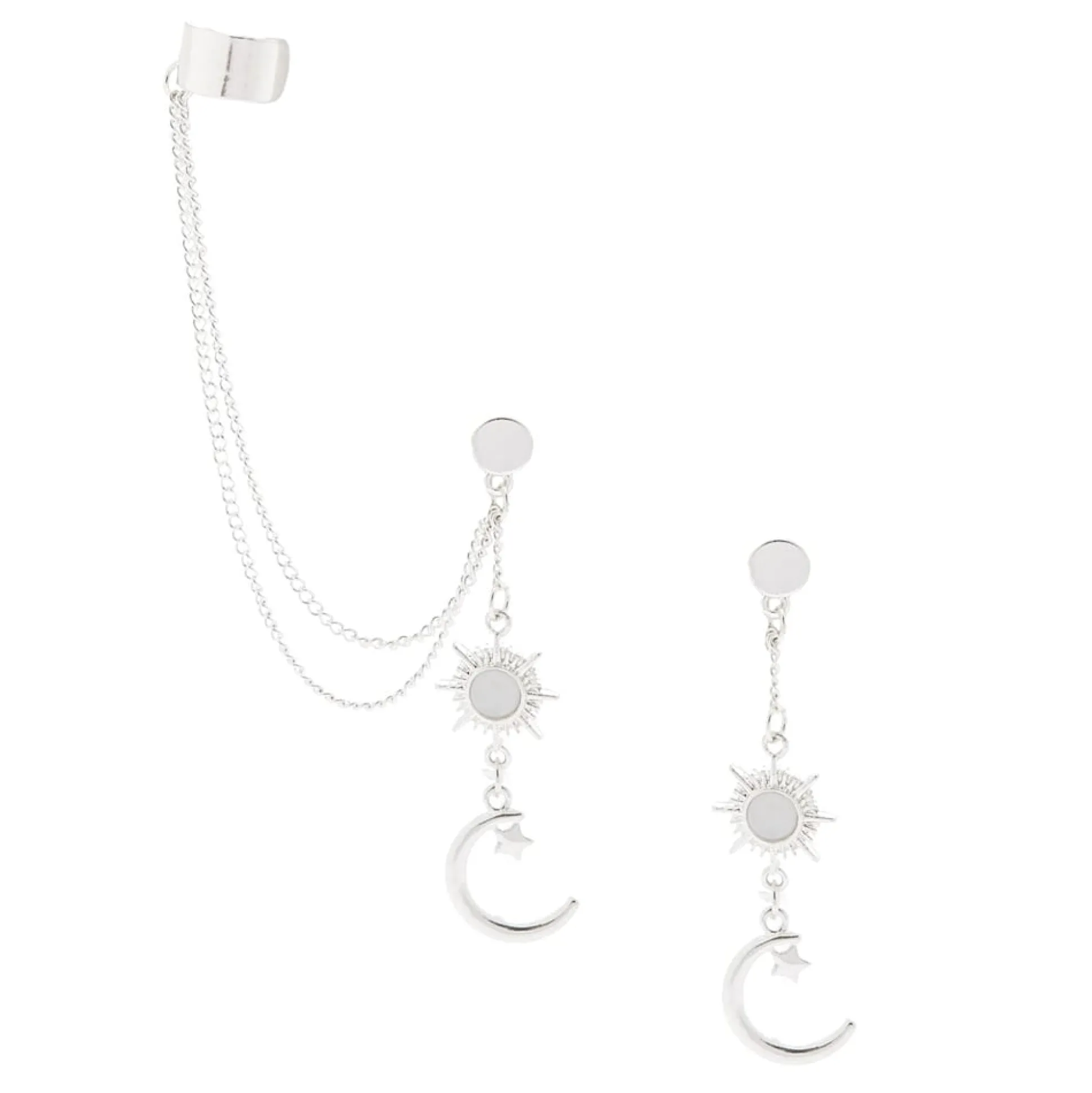 Add out of this world charm to your outfit with this shiny chain ear cuff. A wide silver cuff is attached to a drop earring by a thin double chain. The other earring in the pair is a drop earing with the same sunburst and crescent moon charms.