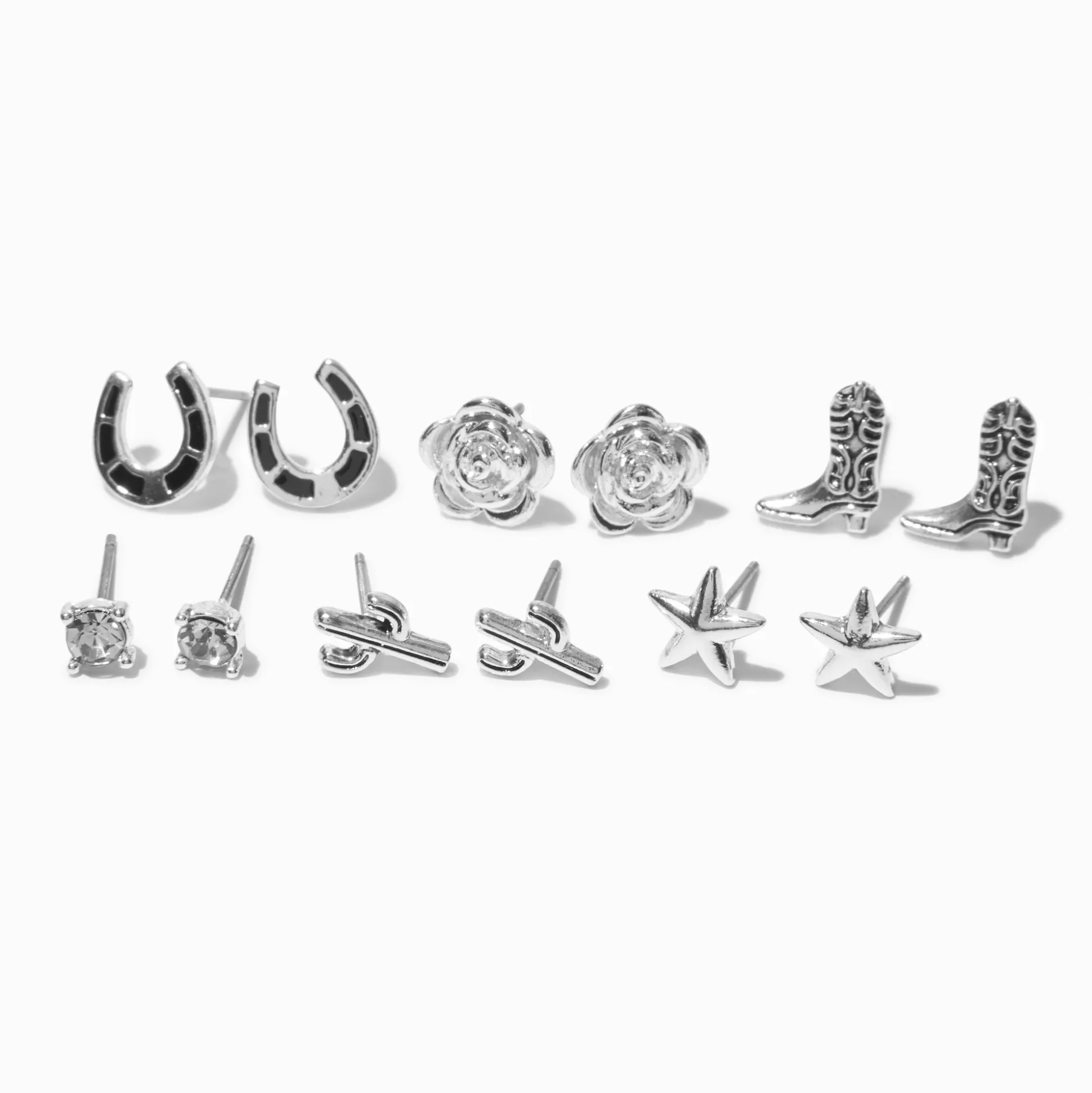 Always have the perfect pair of earrings with this expansive set. The 6 pack includes cowgirl icons, like: boots, horseshoes and more.