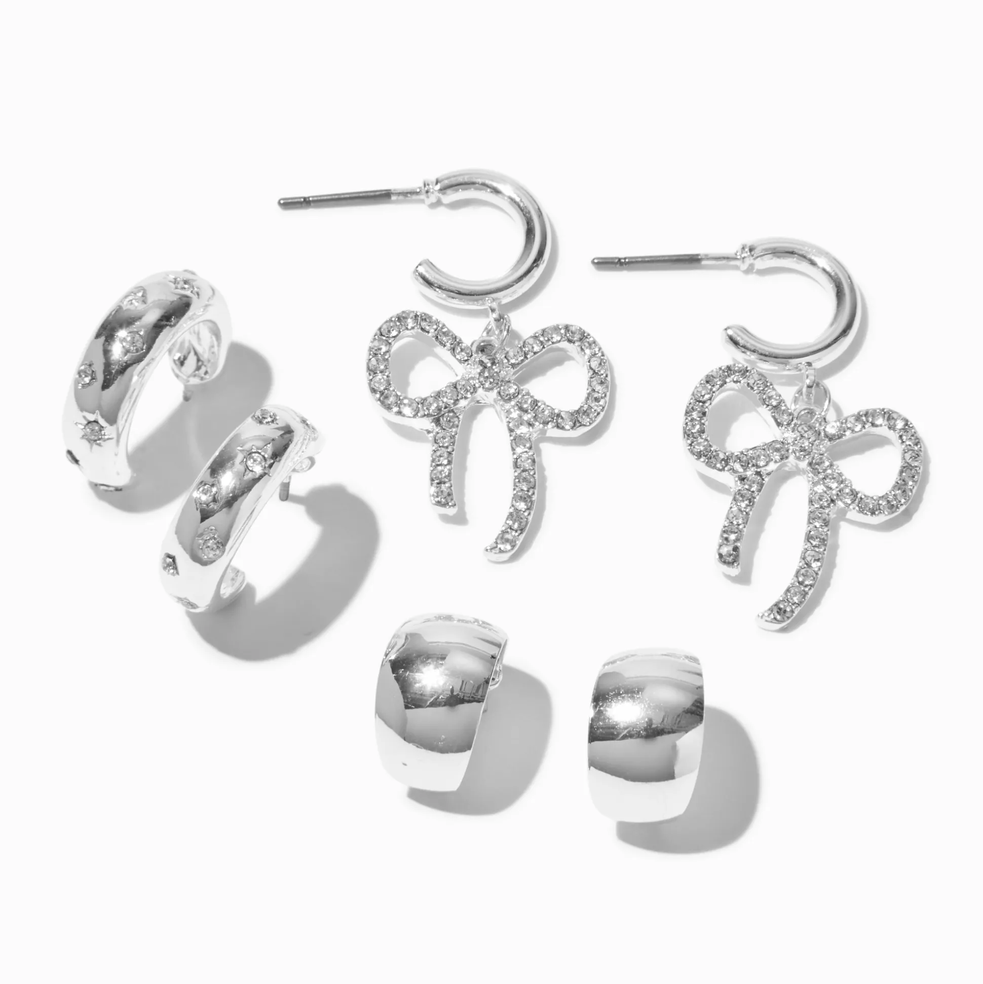 Be the most you and show off your multiple piercing with this earring stackables set. The silver-tone threesome includes drop earrings with bows, thick hoops studded with faux crystals, and plain thick hoops.
