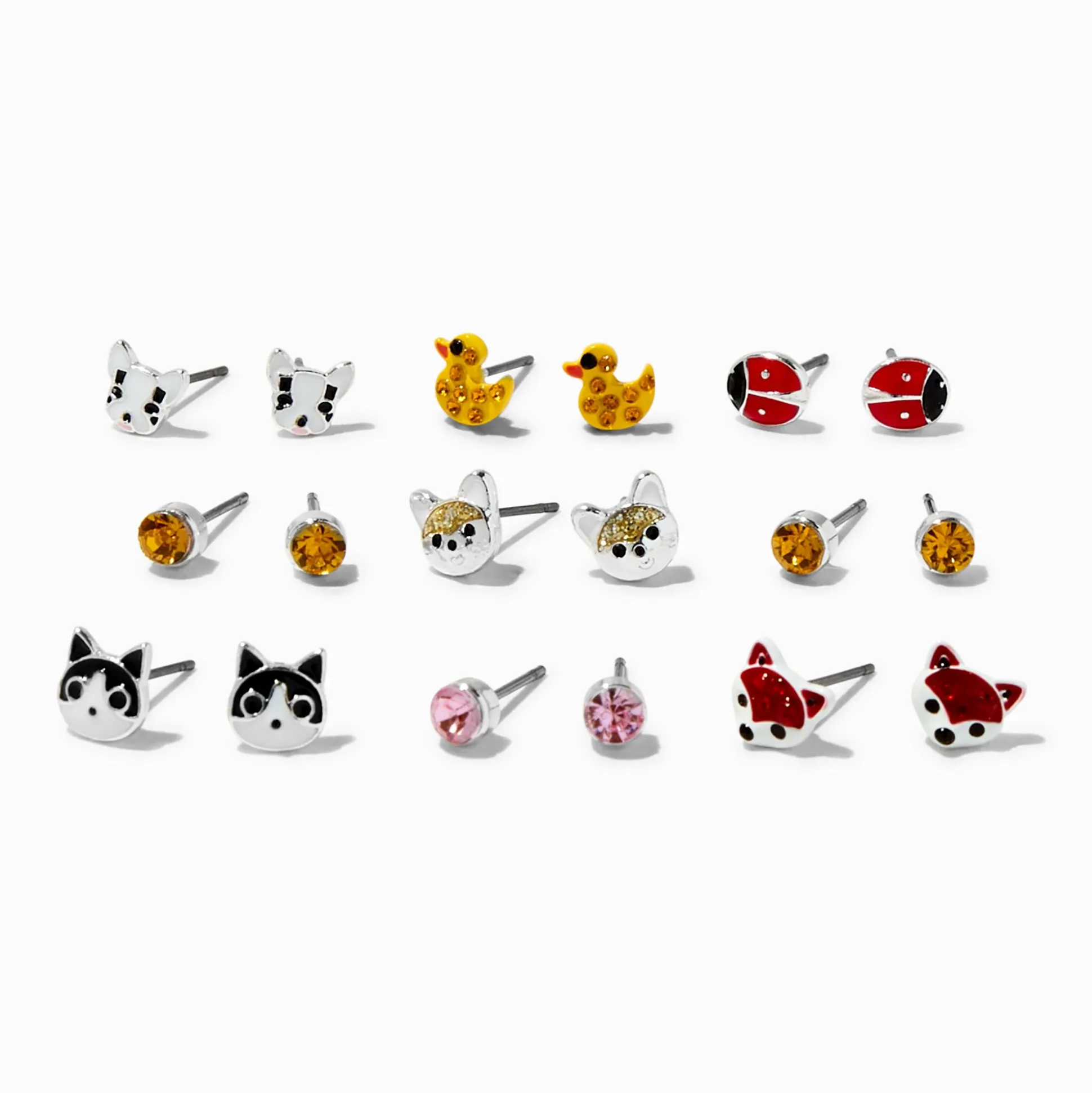 Celebrate your love of animals with this sparkly earring set! The silver-tone set includes six pairs of assorted critter studs, some accented with faux crystals, plus three pairs of coordinating faux crystal studs. With dogs, ducks, foxes, and more, you’ll have a hard time choosing which pair to wear first.