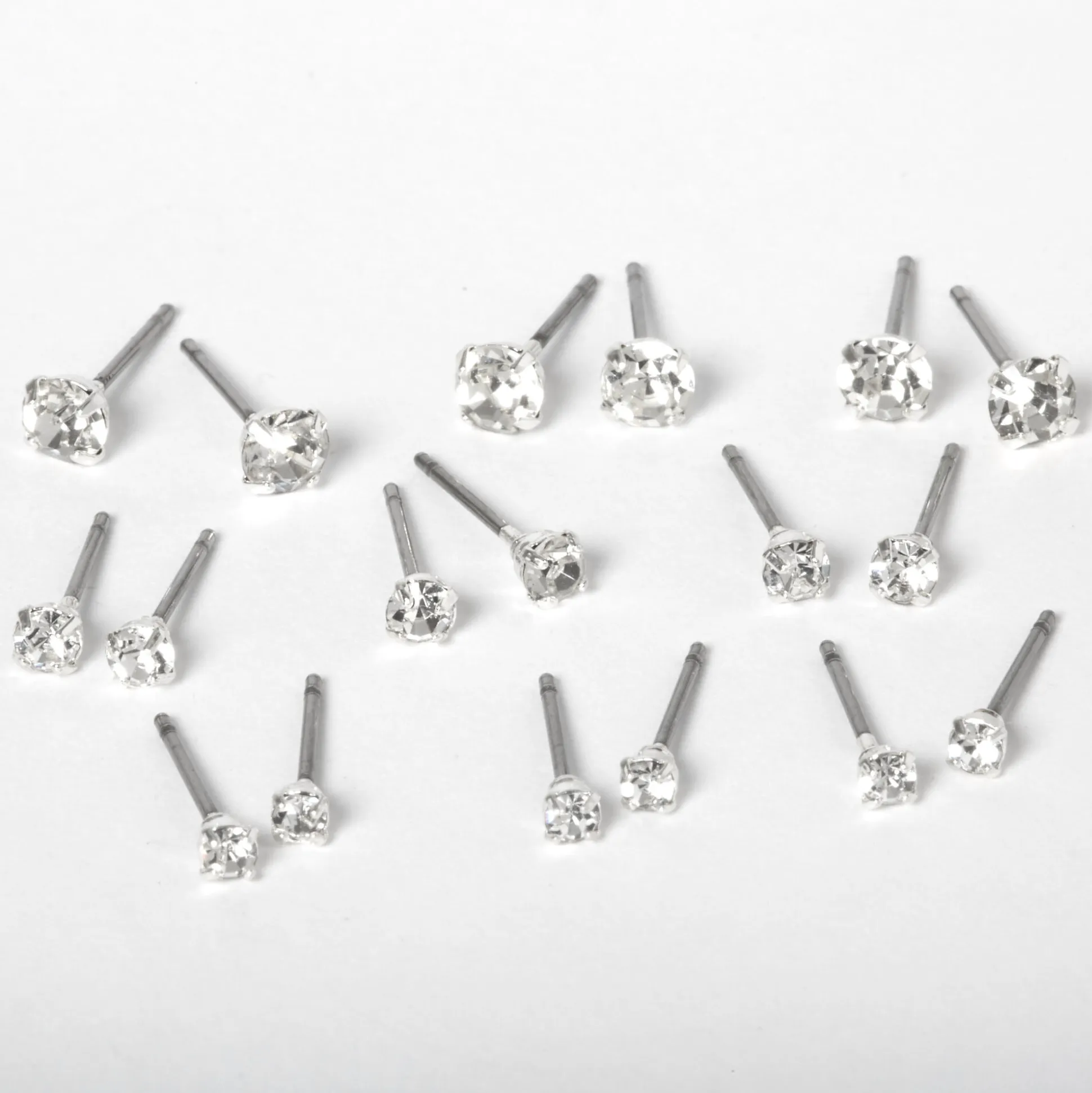 Never run out of stud earrings with this set! This pack includes nine pairs of stud earrings in three different sizes of sparkly cubic zirconia embellishments.
