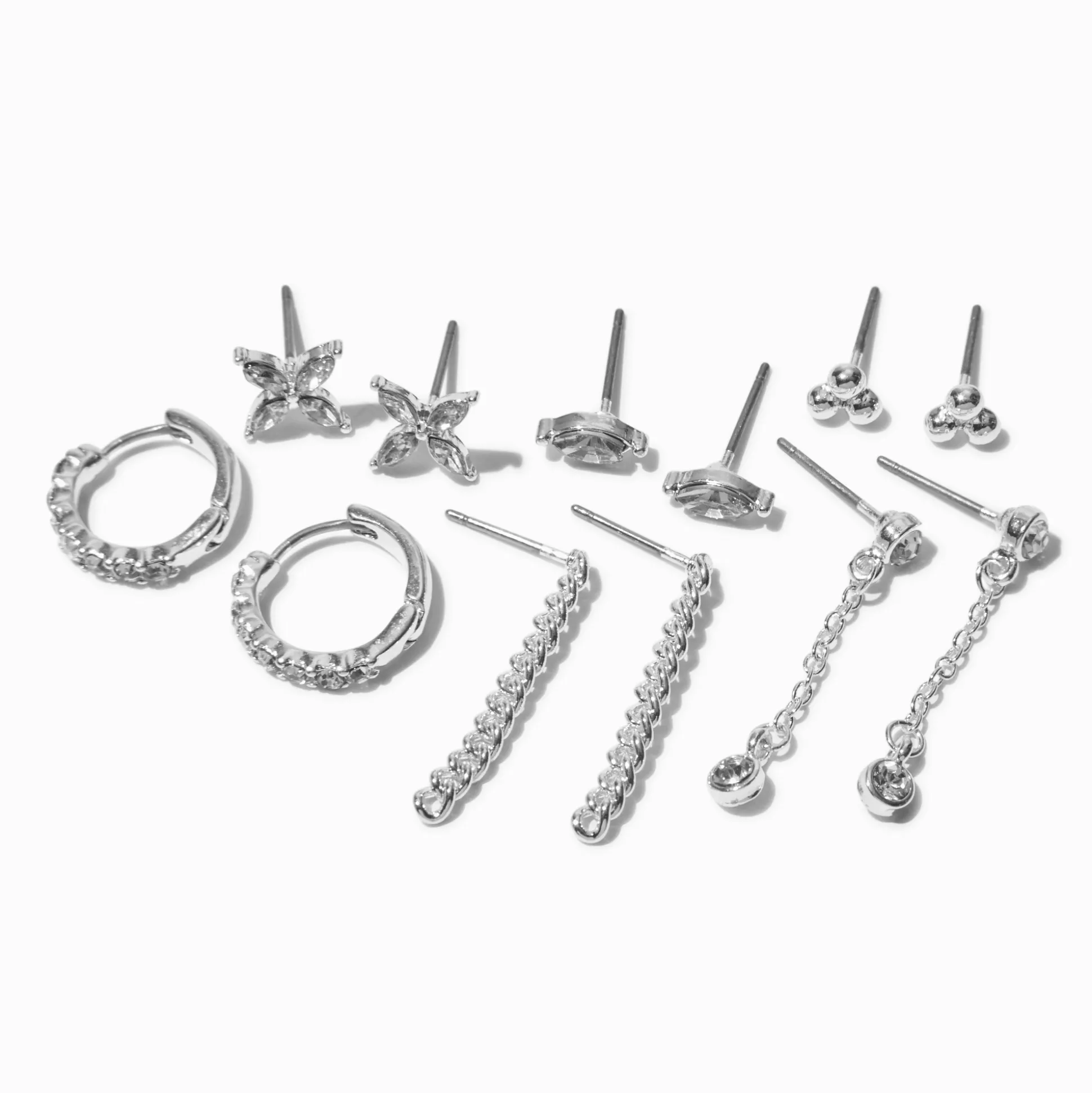 Decorate your ears and show off your multiple piercing with this silver-tone earring set. The six pack includes hoops, drops, and studs with faux crystals, chains, and studs with butterflies, evil eyes, and tri-balls.