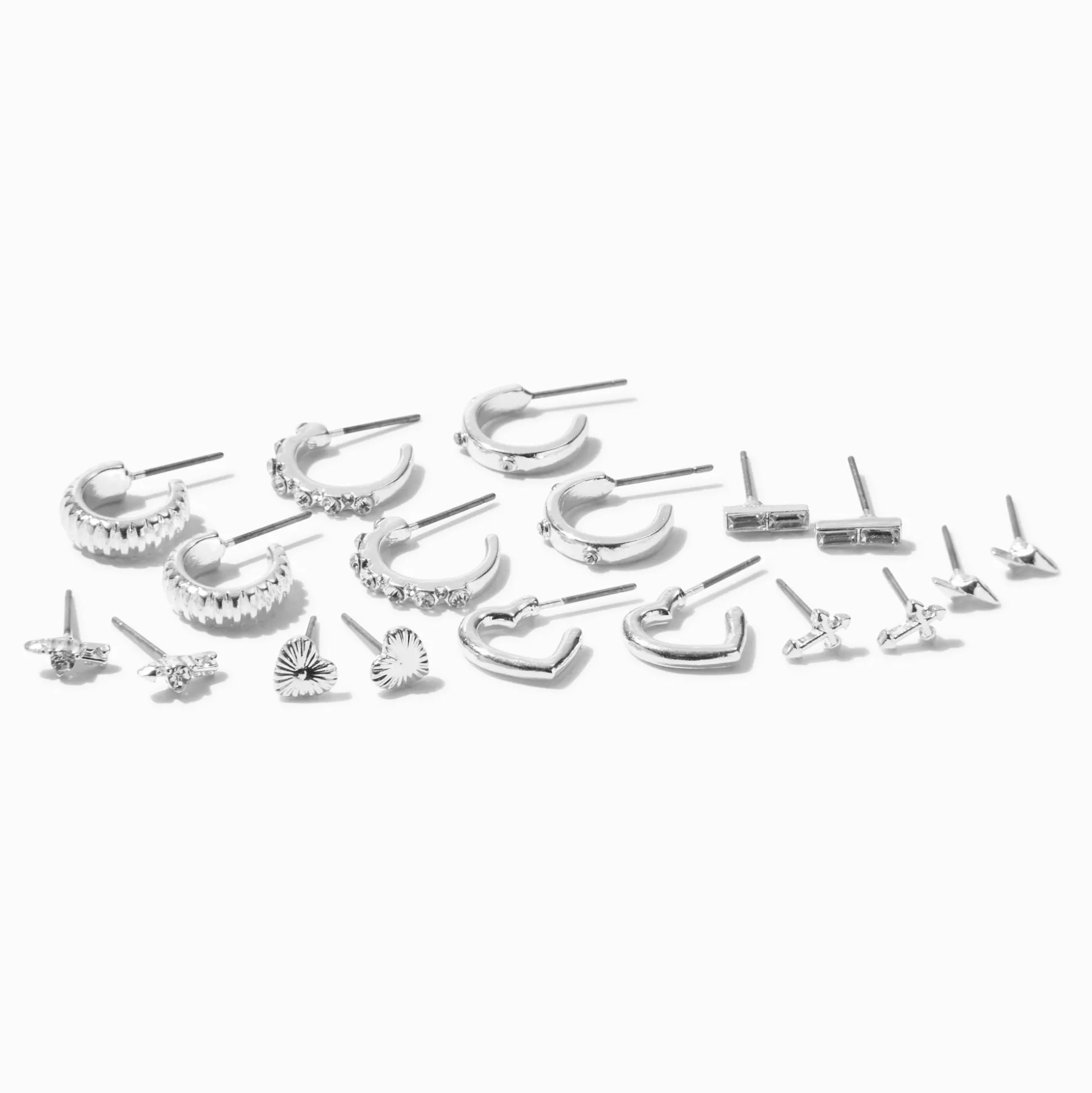 Stack these coordinating hoops and create your own earscape. Perfect for showing off your double or more piercings. The silver-tone set includes studs and hoops with hearts, textures, crosses, faux crystals, and more.