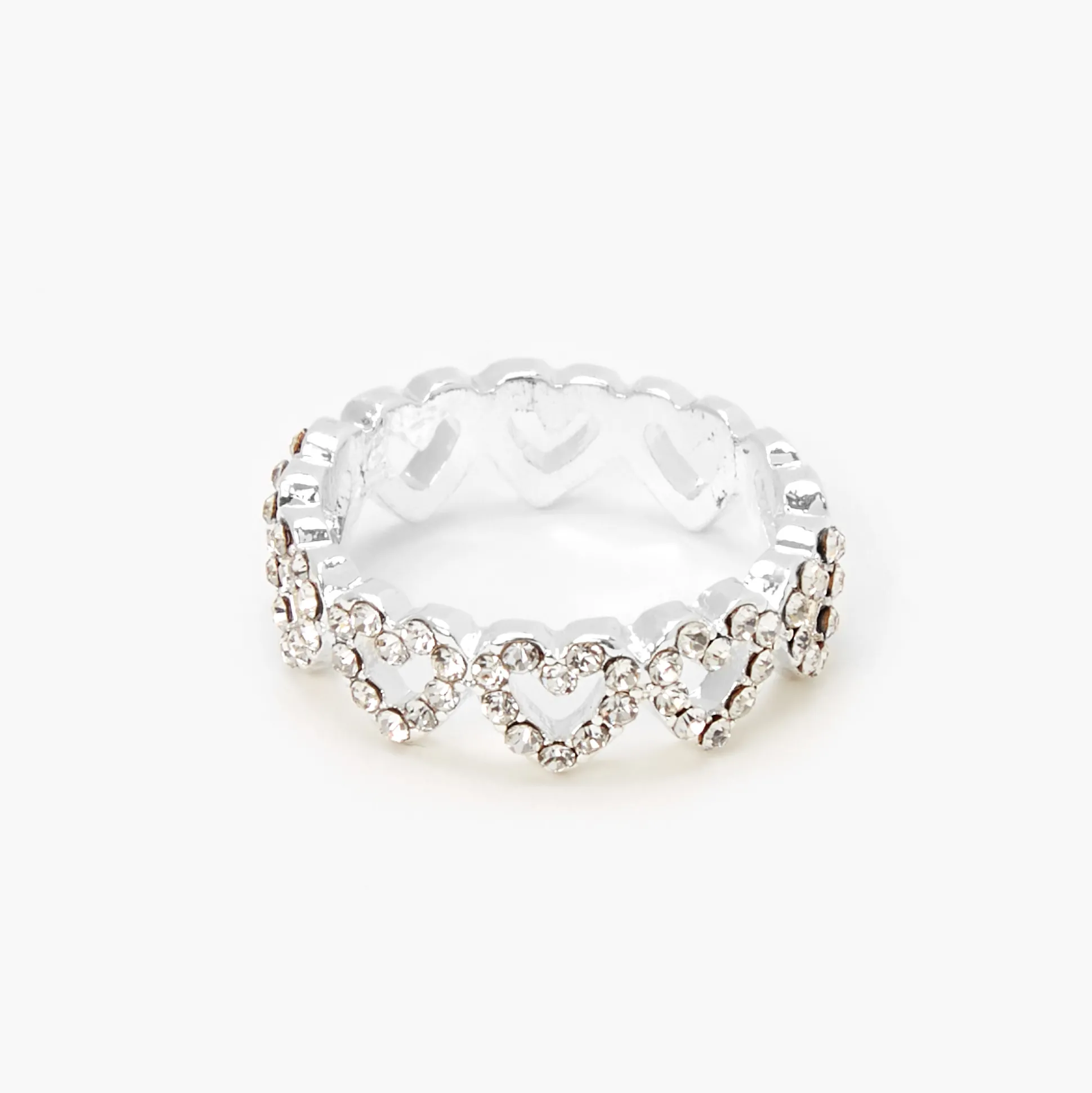 Add some sparkly hearts to your ring collection! This silver-tone ring features an open heart design embellished with faux crystals all around the band.