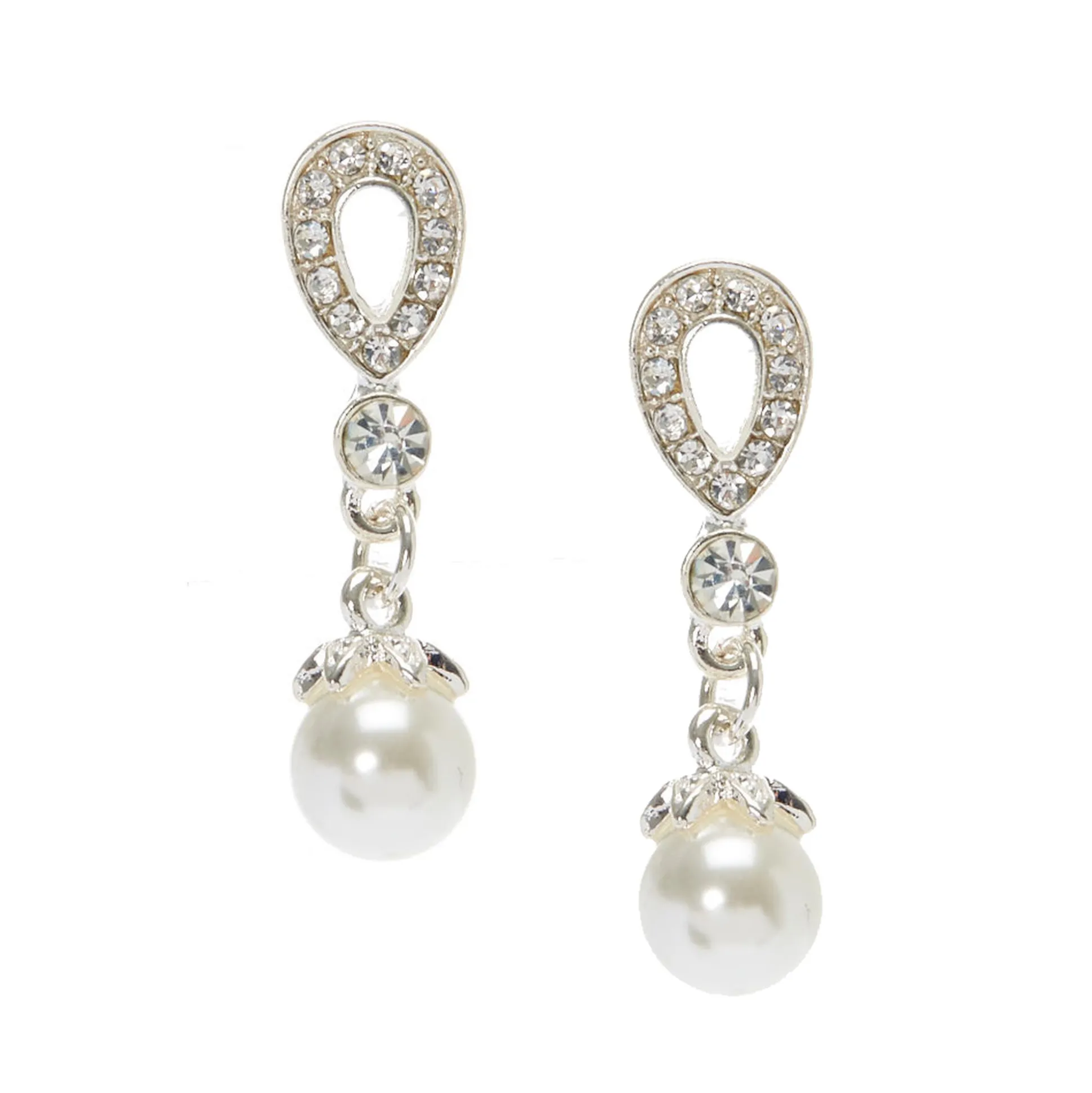 Show off your pearly whites! These pearl embellished earrings feature a crystal tear drop shaped stud with dangling drop ivory pearls Perfect for dressing up your look!
