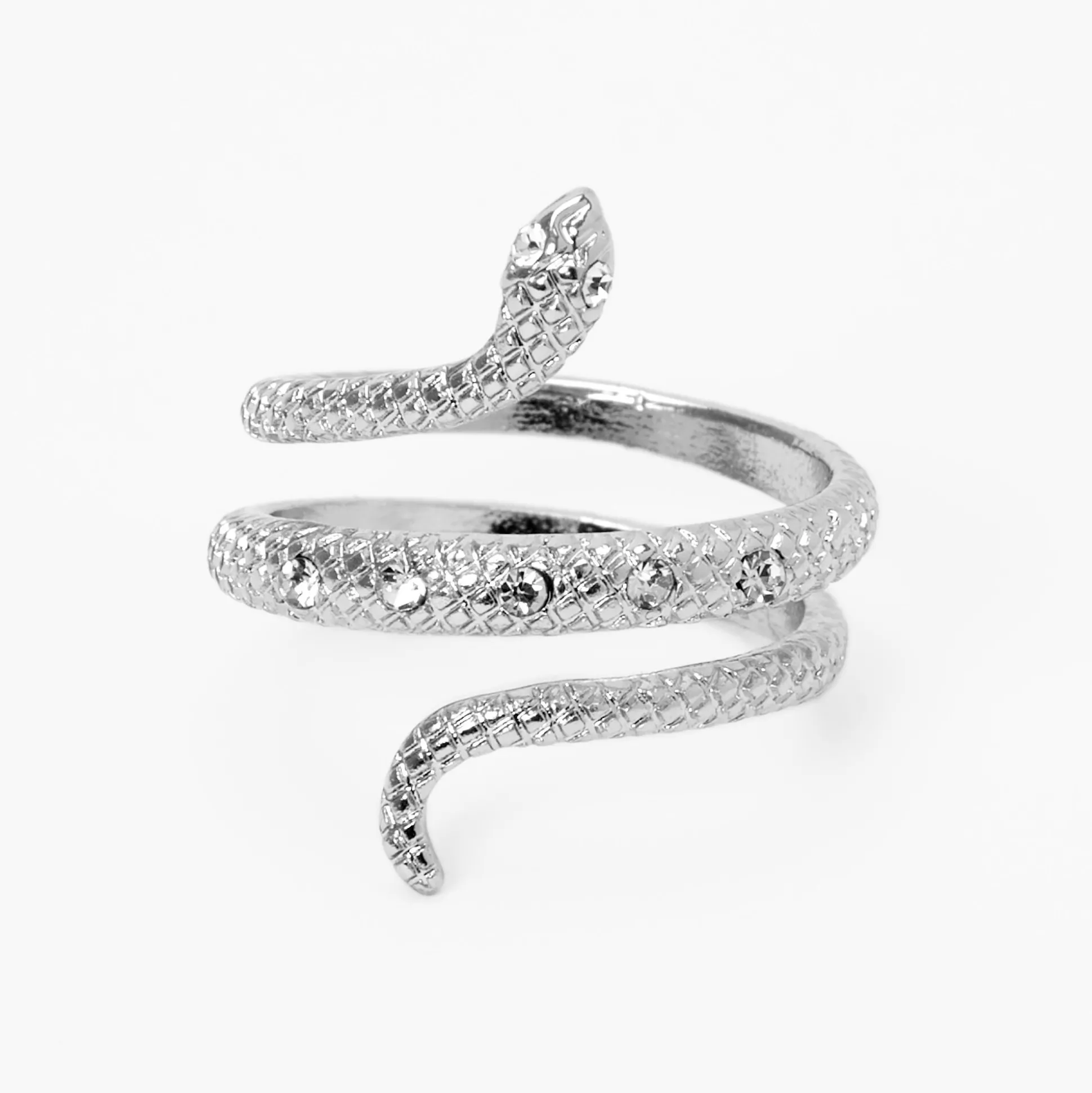 Add an edgy, yet stylish jewelry accessory to your look! This silver-tone ring features a snake wrap design with a textured detail and sparkly faux crystal accents.