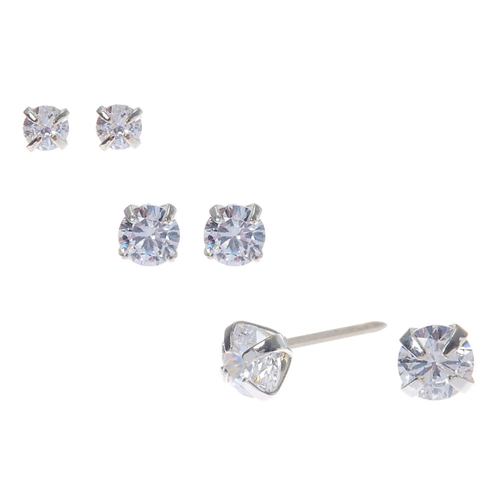 Sparkle a little or sparkle a lot with this set of stud earrings! Set includes 3 pairs of stud earrings with 3 different sizes of square shaped cubic zirconia stones.