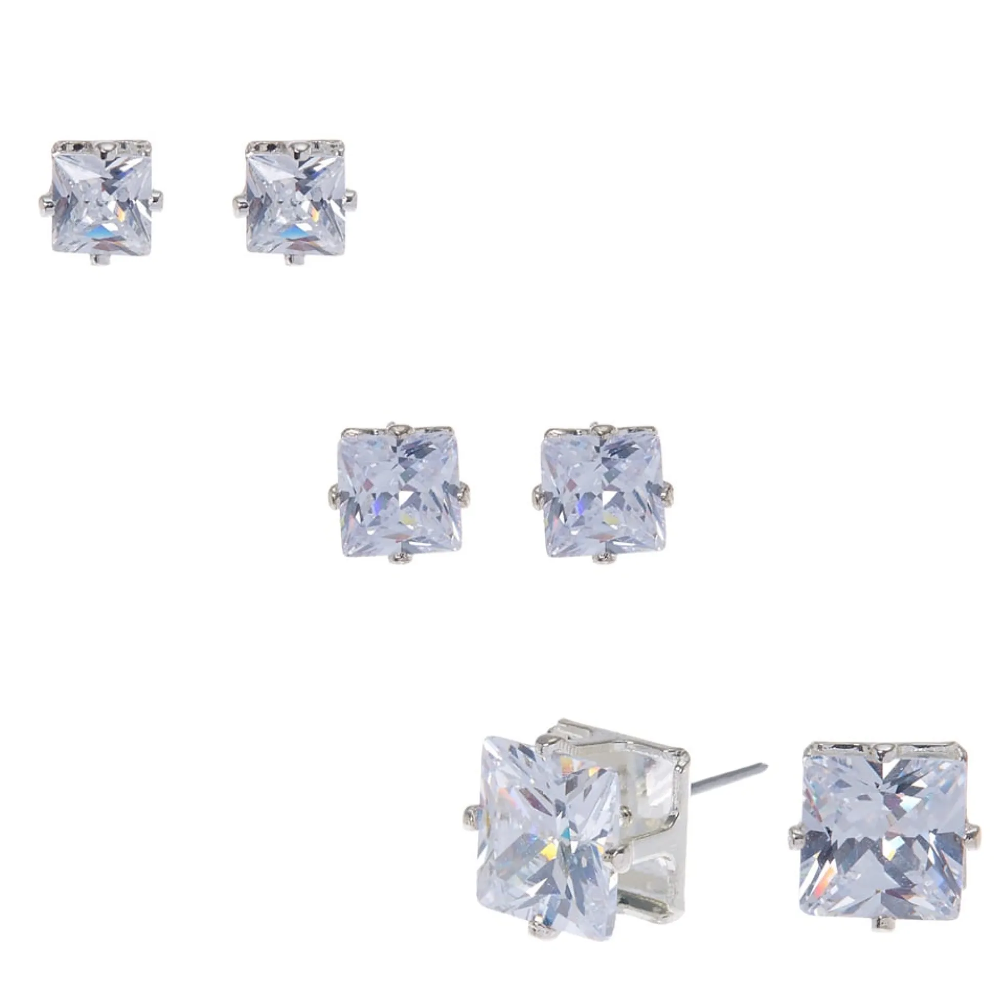 It’s always a good fashion choice to stock up on a sparkling staple! This earring set includes 3 pairs of studs in 3 different sizes of square shaped cubic zirconia stones.