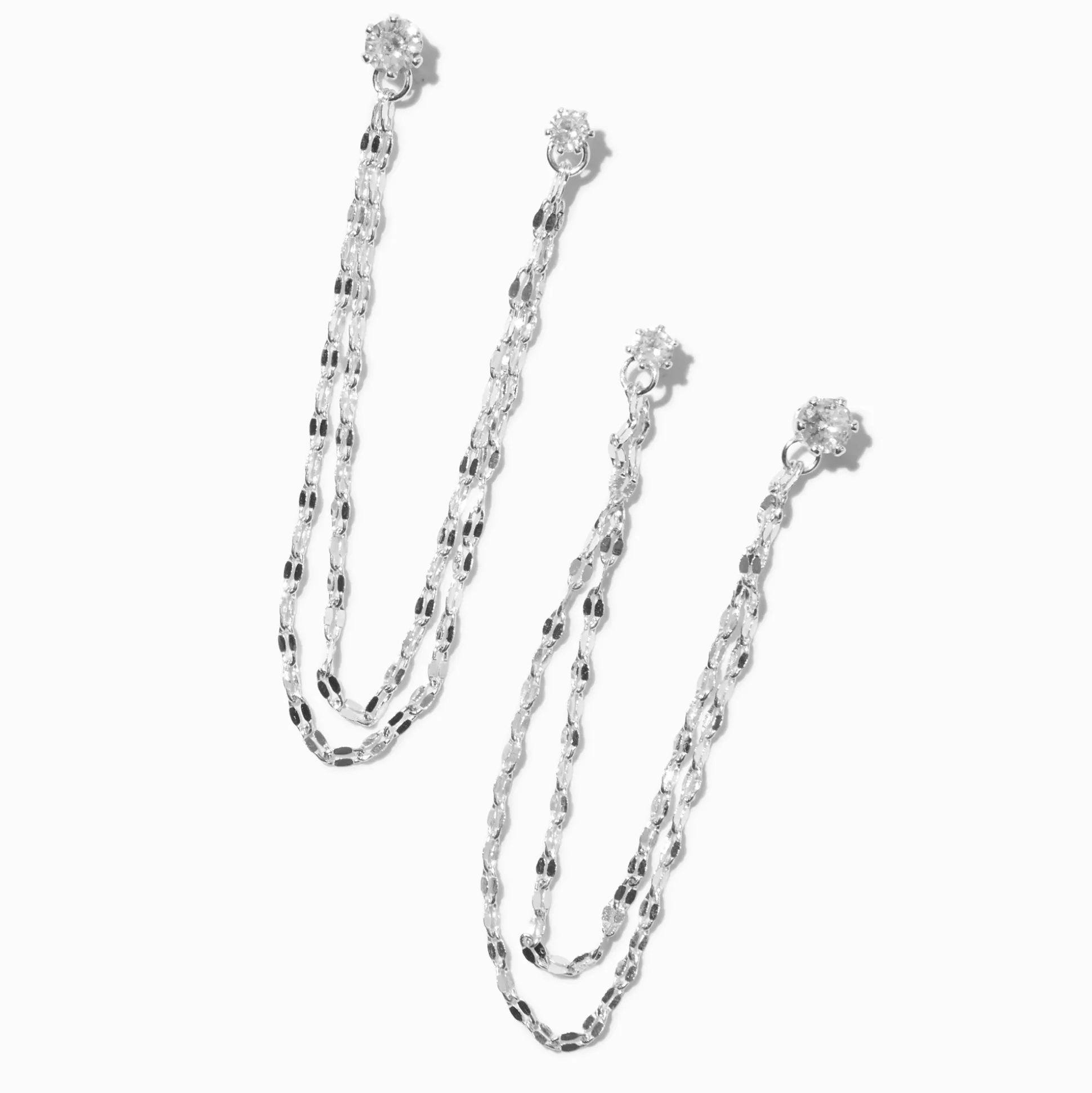 Show off your double piercing in sparkly style with this pretty pair of connector stud earrings. Two round cubic zirconia stones are joined together by a pair of twinkling silver-tone chains.