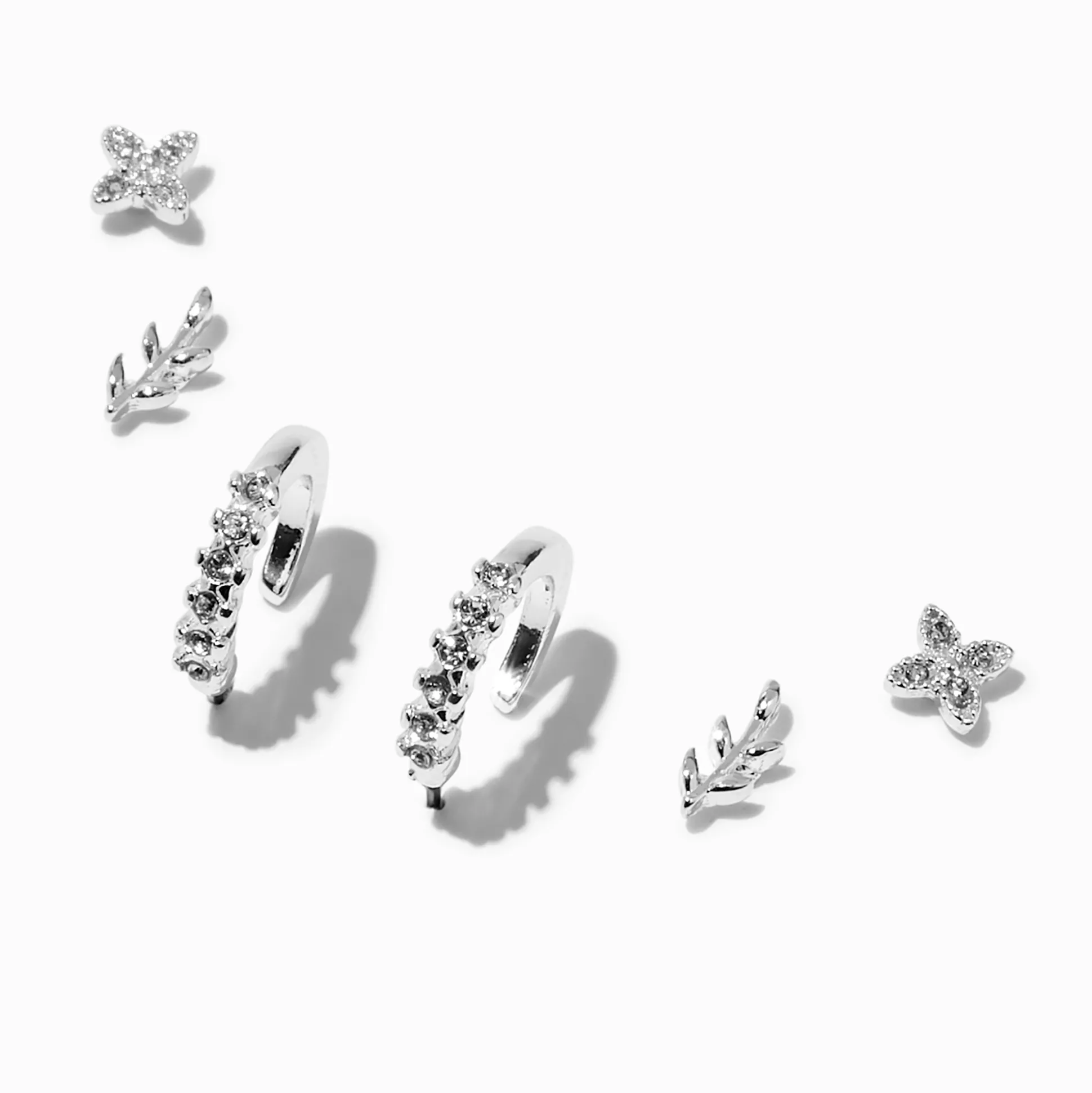 Create a nature-inspired earring stack with this fetching set. The three-pack includes hoops with cubic zirconia details and two studs with vine and leaf designs.
