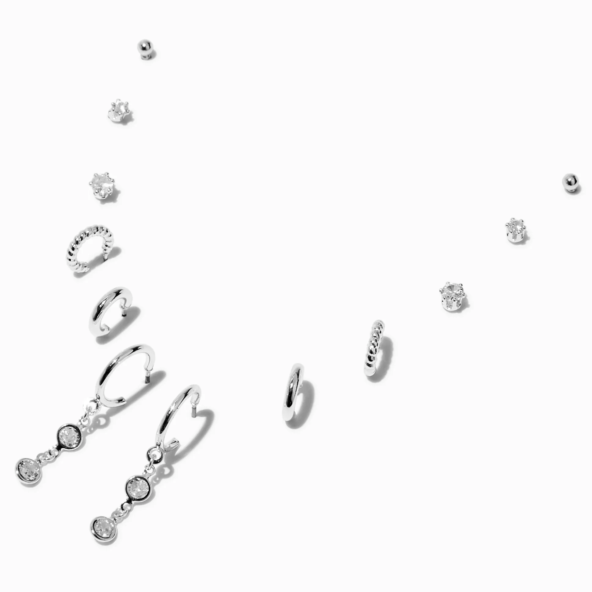 Show off your multiple piercings with earrings that coordinate perfectly together! The star of this 6-pair pack is hoops featuring two dangling charms made of sparkling faux crystals. Mix or match with the other pairs in the set, including plain hoops, twisted hoops, and a variety of studs.