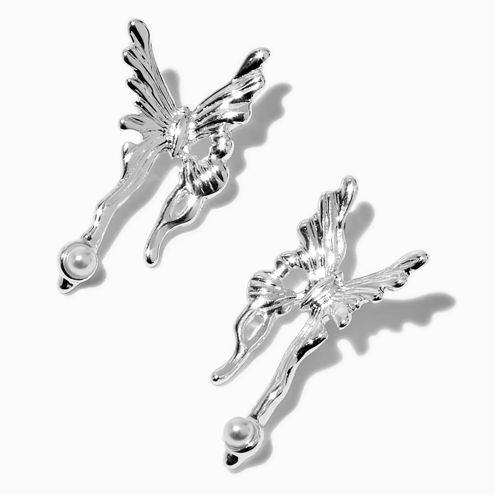 Rock some serious butterfly vibes in these stud earrings. The silver-tone designs are covered in a melting butterfly design. Plus, they have a dainty faux pearl detail.