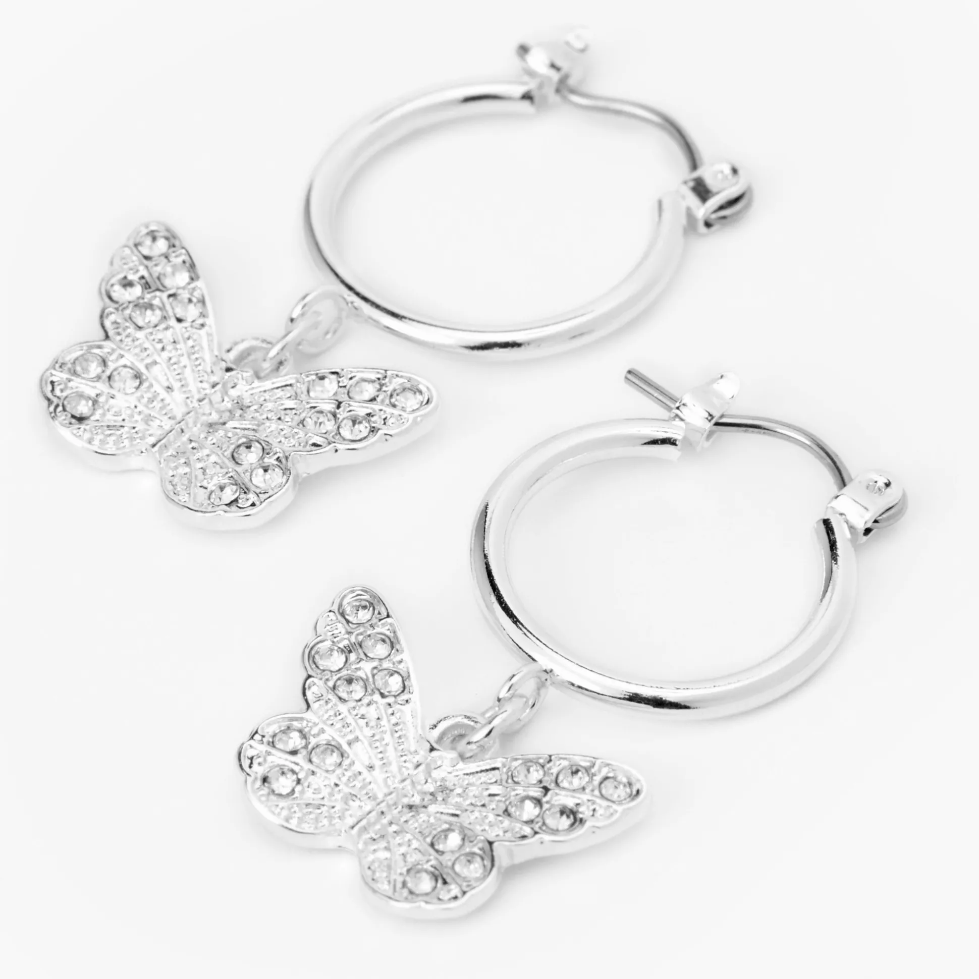 These earrings are a must-have jewelry accessory for the girl who loves butterflies! The dainty silver-tone hoops feature a filigree butterfly charm hanging from the bottom of each earring.