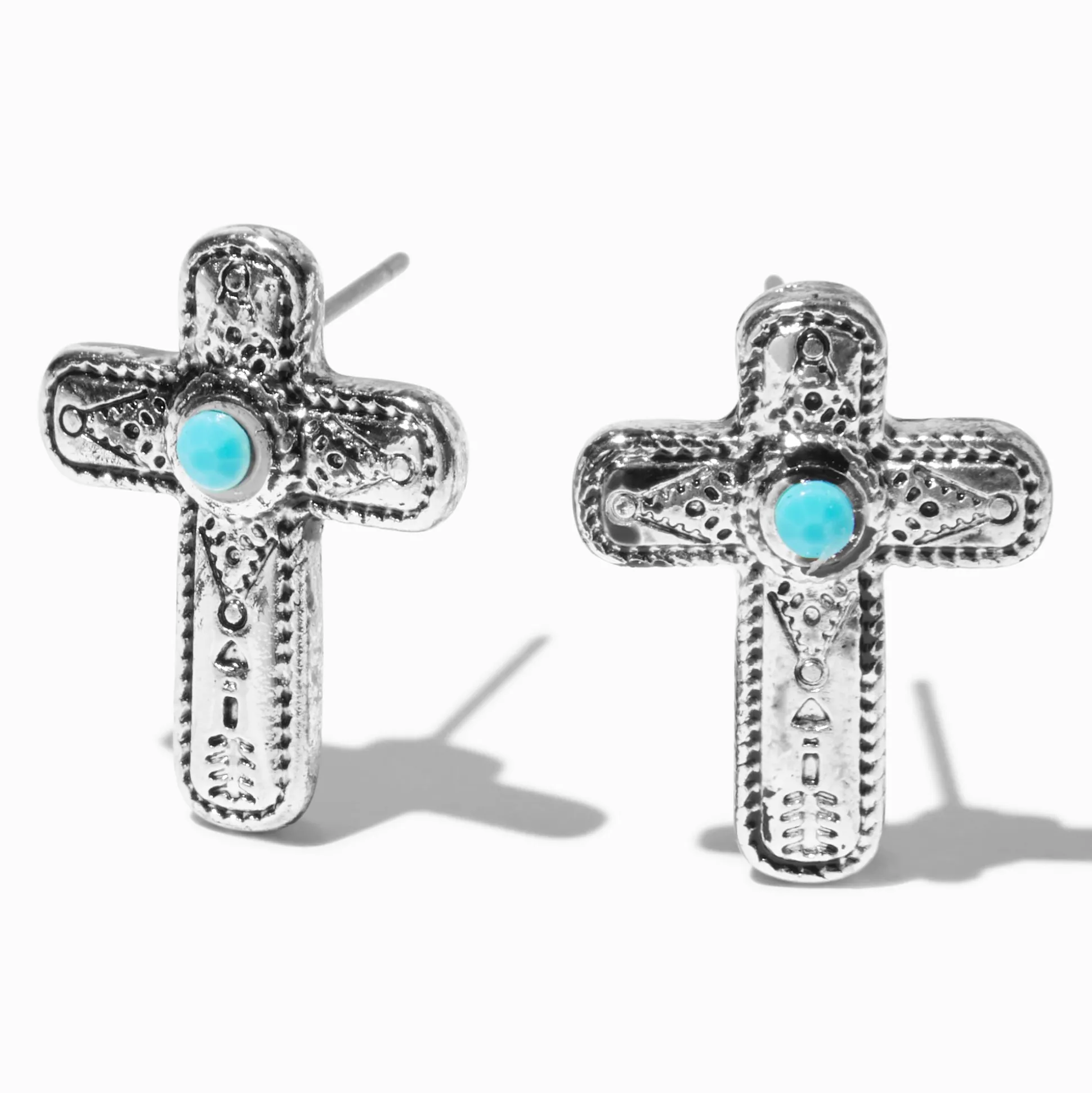 Yeehaw! These stud earrings are IT. The post-back earrings have filigree and turquoise detailing inside a silver-tone cross.