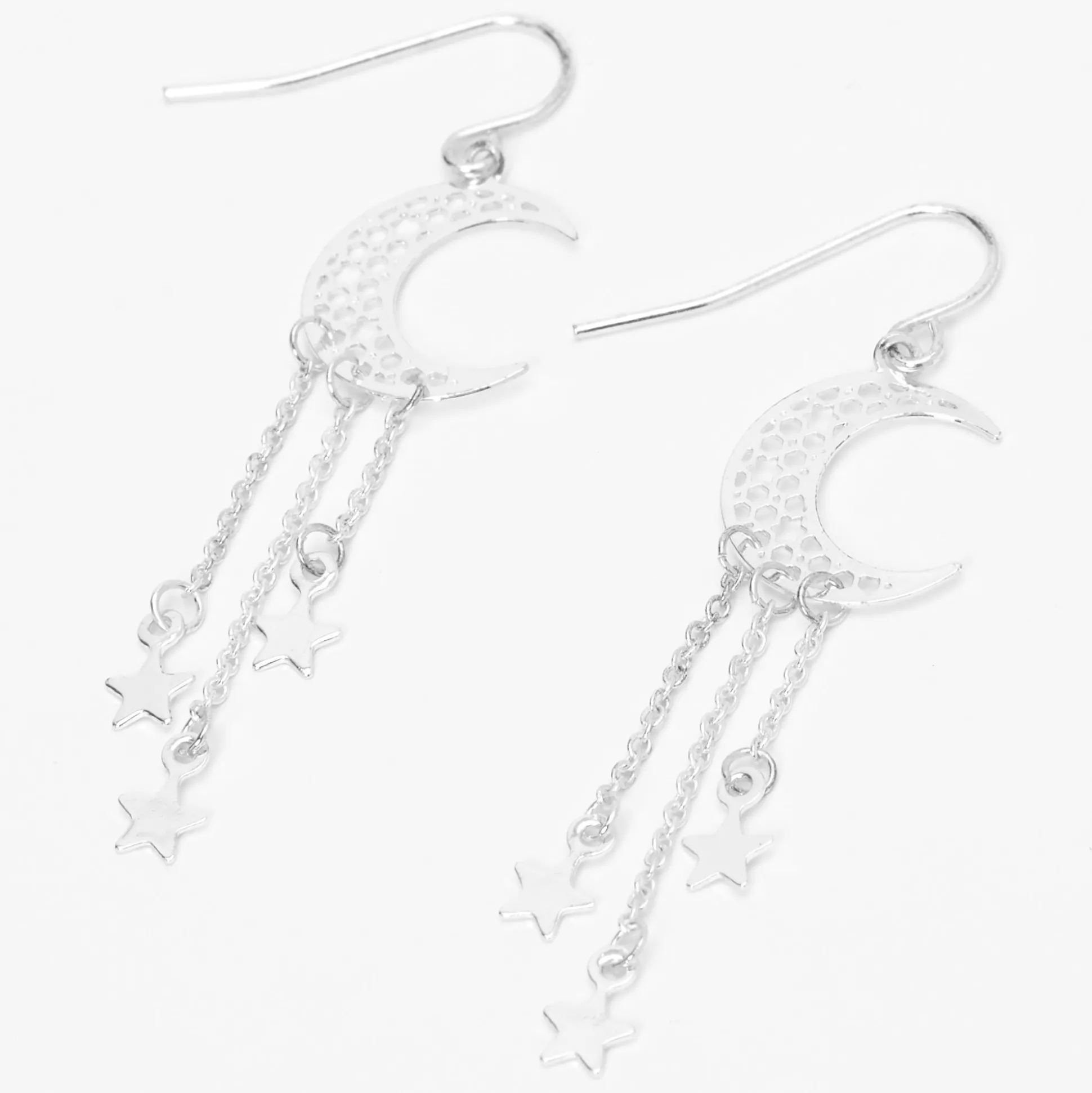 Rock some major celestial vibes with these drop earrings! This pair of earrings feature three star charms dangling from each crescent moon.