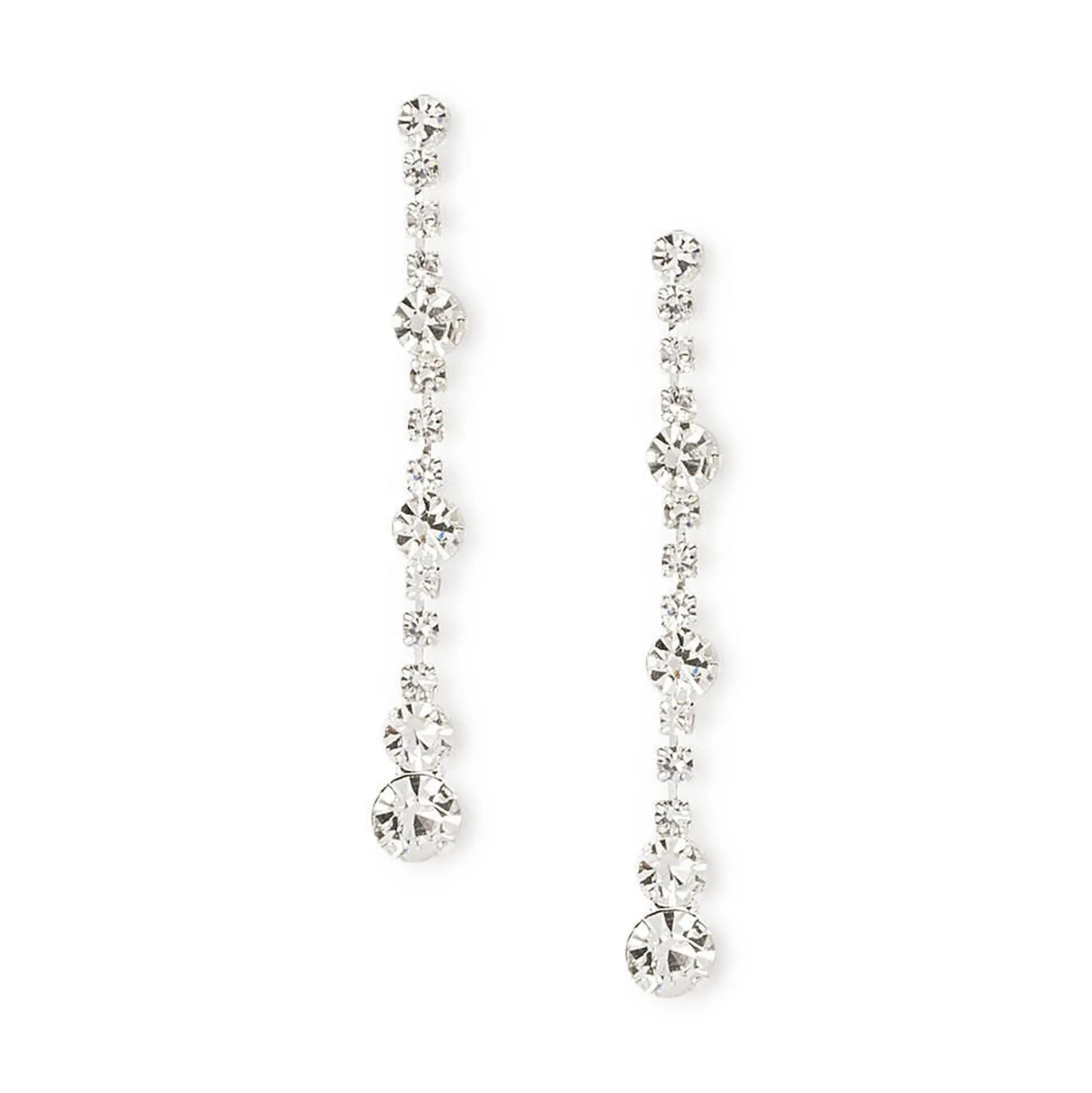 Dazzle with delicate sparkle in these simple and stunning drop earrings. Silver-tone setting have glass rhinestones evenly spaced along them in a graduated design.