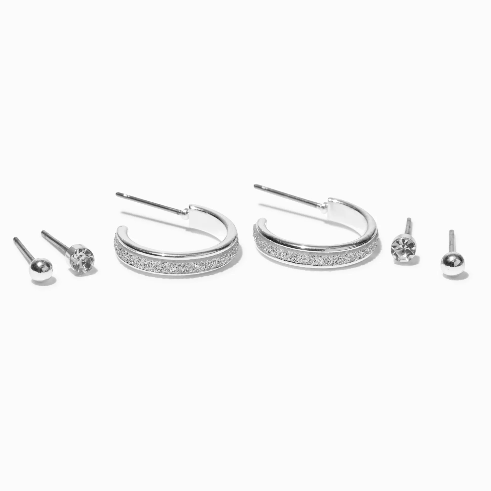 Show off your multiple ear piercings with this silver-tone set. It includes glitter-finished huggie hoops, plain ball studs, and faux crystal studs. Wear these all together or however you’d like. You’re handing out the ear party invites.