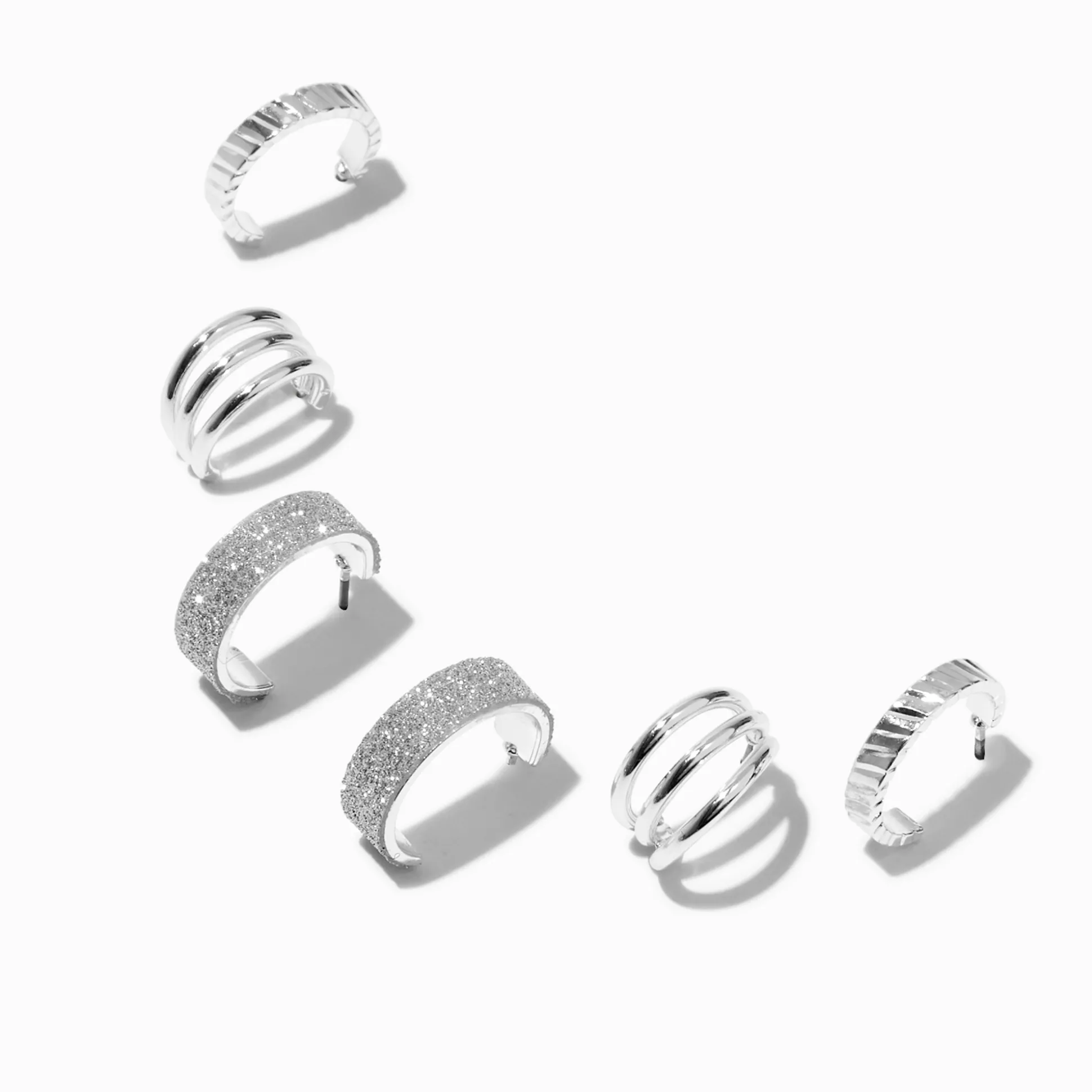 Stack these coordinating hoops and create your own earscape. Perfect for showing off your double or more piercings. The set has a textured option, one with three rings, and wide one that has a glittery finish.