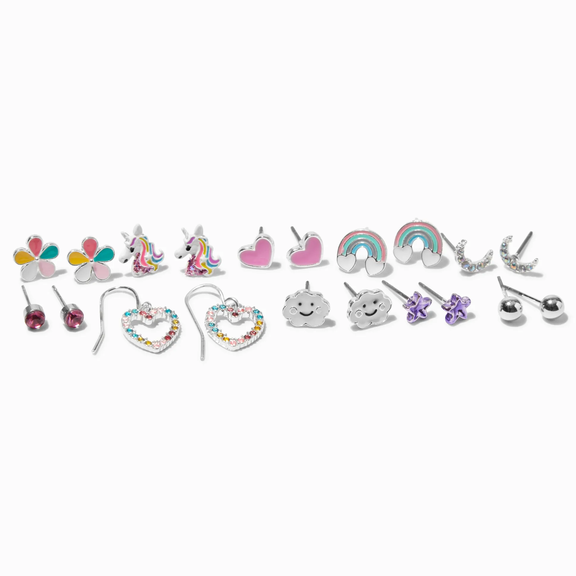 Always have the perfect pair of earrings with this expansive set. Nine pairs plus one bonus include flowers, unicorners, hearts, rainbows, crescent moons, bezel-set faux crystals, heart drops, clouds, purple stars, and silver-tone balls.