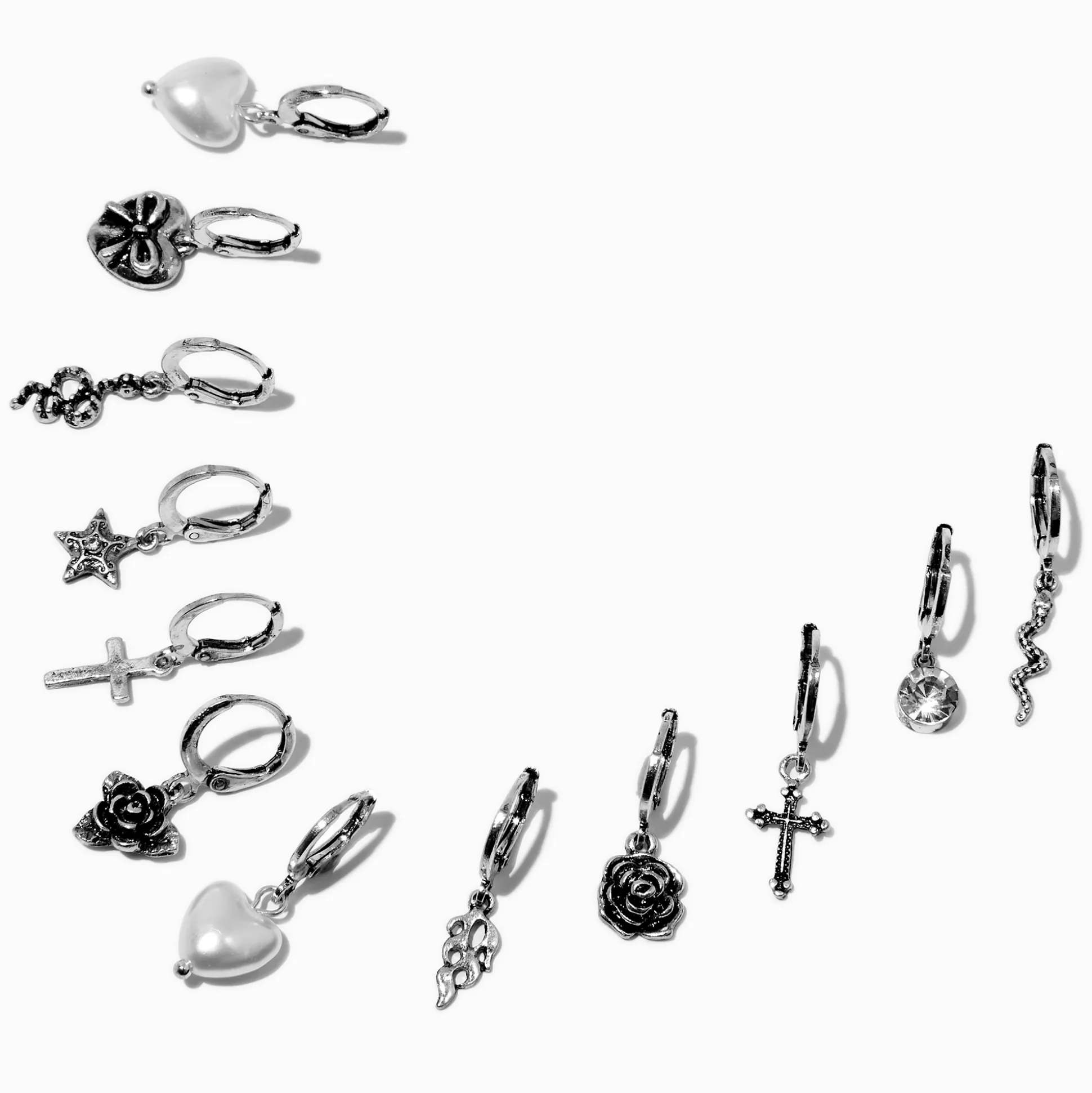 Match your indie rock vibe to your indie rock look with this pack of 12 hoop earrings. The silver-tone designs include 12 different designs, so you don’t have to be so matchy-matchy. Designs include pearls, faux crystals, snakes, crosses, and much more.