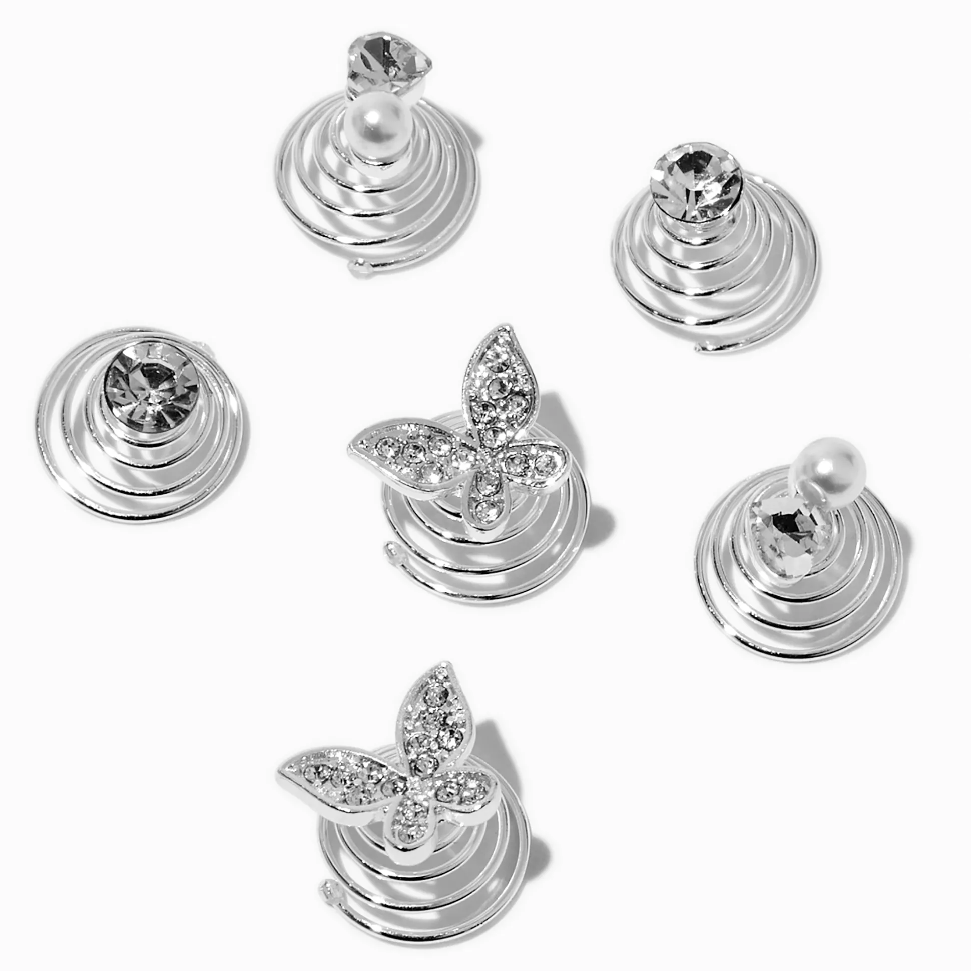 Get party ready by adding a whimsical touch to any updo with these hair spinners. Featuring a faux rhinestone design, these hair spinners have sparkly butterflies, faux crystals, and faux pearls.