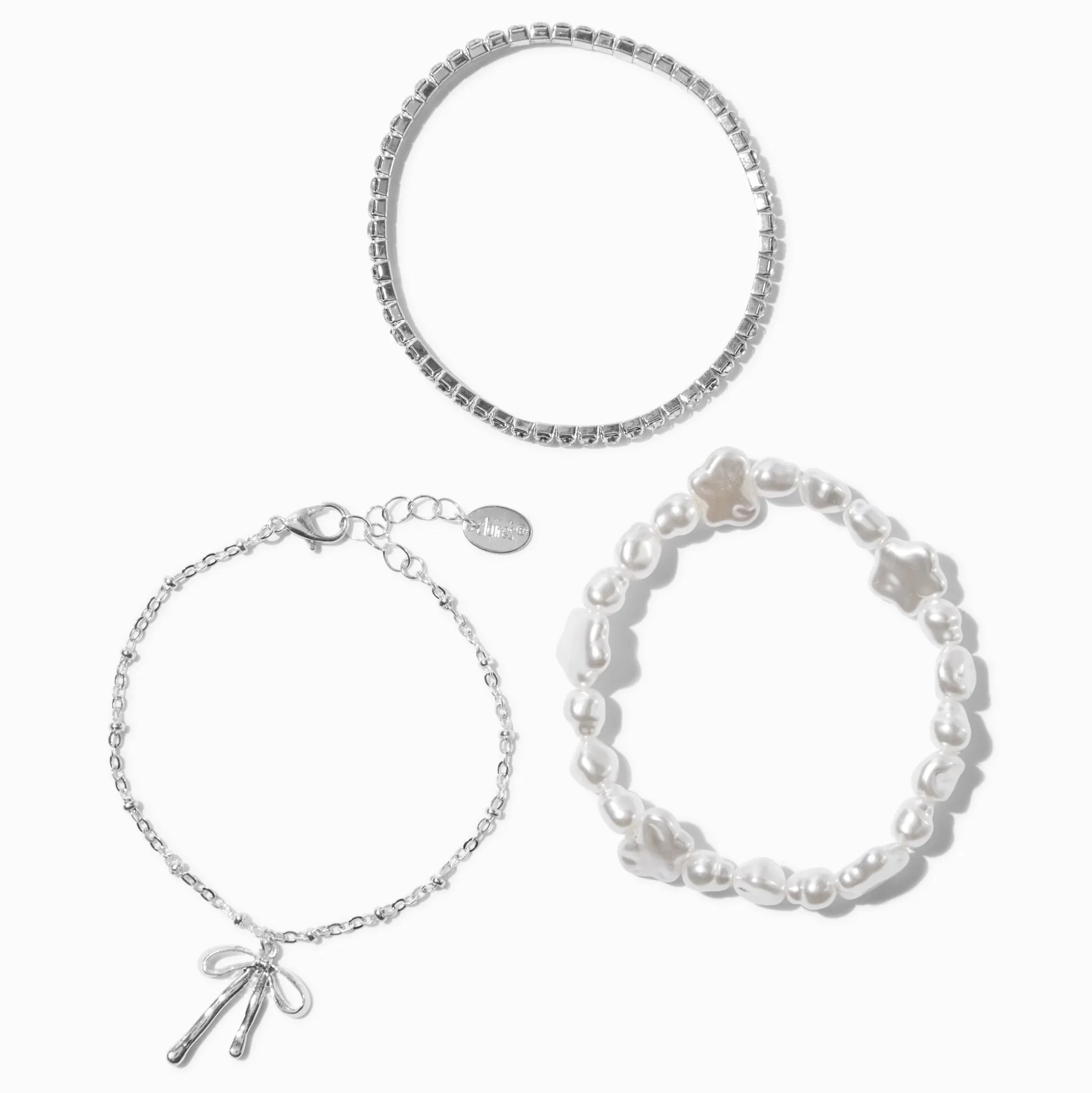 Create a bracelet stack on your wrist with this easy three-pack set. The silver-tone bracelets include a stretch cup chain bracelet, faux pearl stretch bracelet with faux pearl butterflies, and a silver-tone chain bracelet with a bow charm.